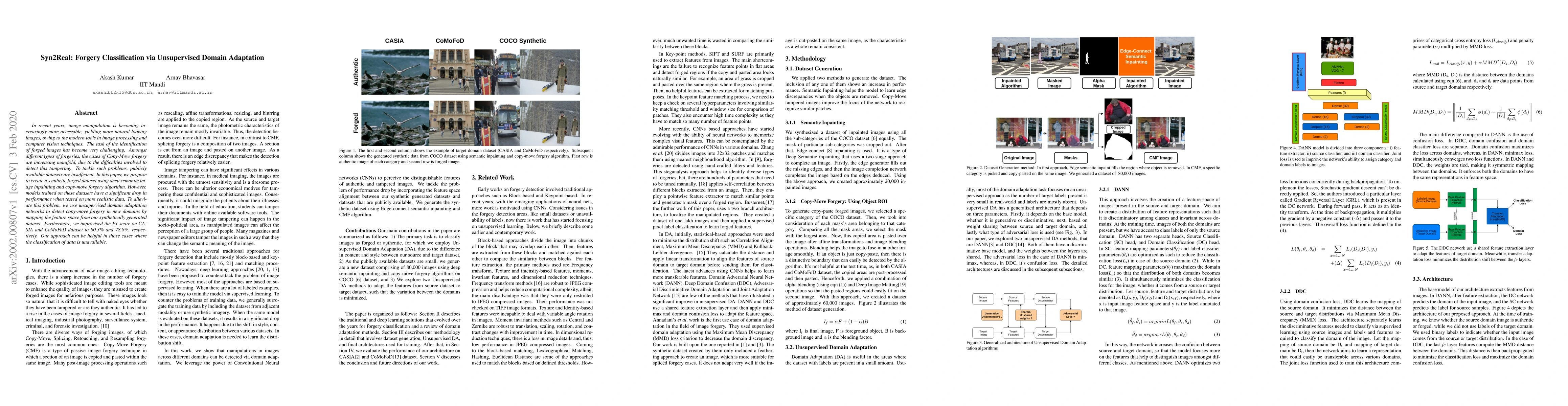 In recent years, image manipulation is becoming increasingly more accessible, yielding more natural-looking images, owing to the modern tools in image processing and computer vision techniques. The task of the identification of forged images has become very challenging. Amongst different types of forgeries, the cases of Copy-Move forgery are increasing manifold, due to the difficulties involved to detect this tampering. To tackle such problems, publicly available datasets are insufficient. In this paper, we propose to create a synthetic forged dataset using deep semantic image inpainting and copy-move forgery algorithm. However, models trained on these datasets have a significant drop in performance when tested on more realistic data. To alleviate this problem, we use unsupervised domain adaptation networks to detect copy-move forgery in new domains by mapping the feature space from our synthetically generated dataset. Furthermore, we improvised the F1 score on CASIA and CoMoFoD dataset to 80.3% and 78.8%, respectively. Our approach can be helpful in those cases where the classification of data is unavailable.