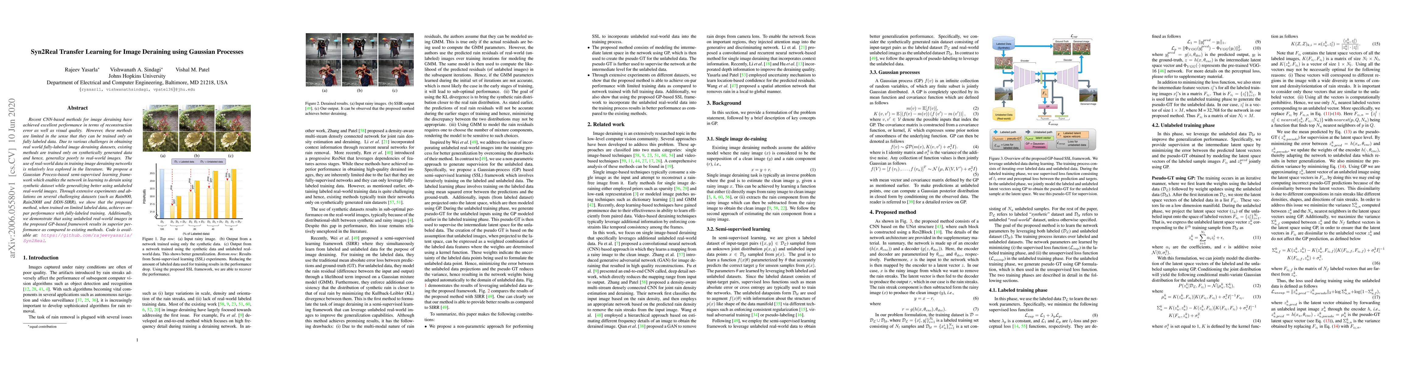 Recent CNN-based methods for image deraining have achieved excellent performance in terms of reconstruction error as well as visual quality. However, these methods are limited in the sense that they can be trained only on fully labeled data. Due to various challenges in obtaining real world fully-labeled image deraining datasets, existing methods are trained only on synthetically generated data and hence, generalize poorly to real-world images. The use of real-world data in training image deraining networks is relatively less explored in the literature. We propose a Gaussian Process-based semi-supervised learning framework which enables the network in learning to derain using synthetic dataset while generalizing better using unlabeled real-world images. Through extensive experiments and ablations on several challenging datasets (such as Rain800, Rain200H and DDN-SIRR), we show that the proposed method, when trained on limited labeled data, achieves on-par performance with fully-labeled training. Additionally, we demonstrate that using unlabeled real-world images in the proposed GP-based framework results in superior performance as compared to existing methods. Code is available at: https://github.com/rajeevyasarla/Syn2Real