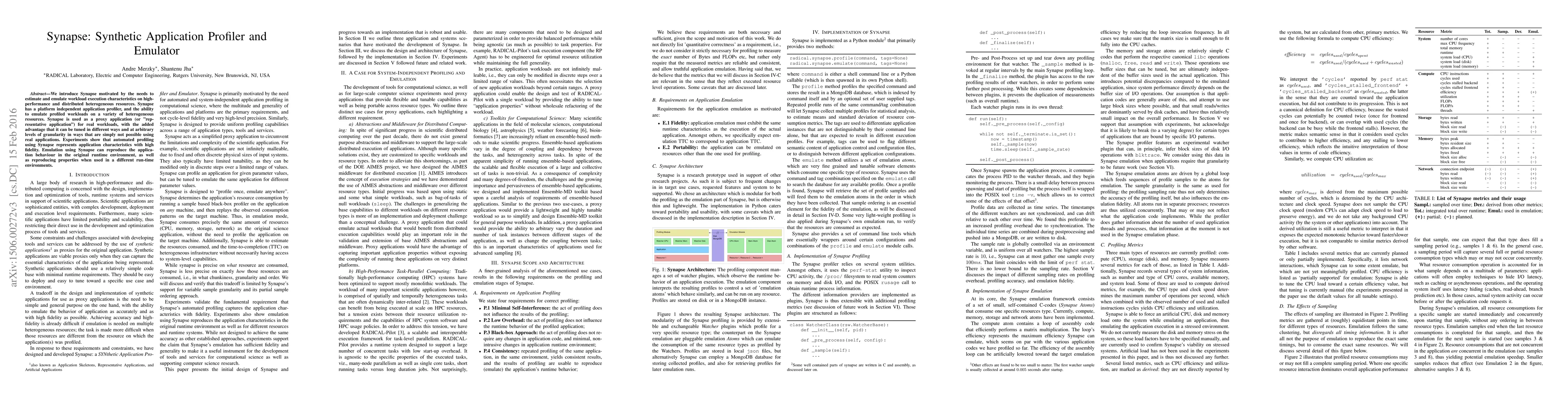 Synapse is a platform-independent tool that accurately profiles application workloads on heterogeneous resources, allowing for precise emulation of behavior in different environments.
