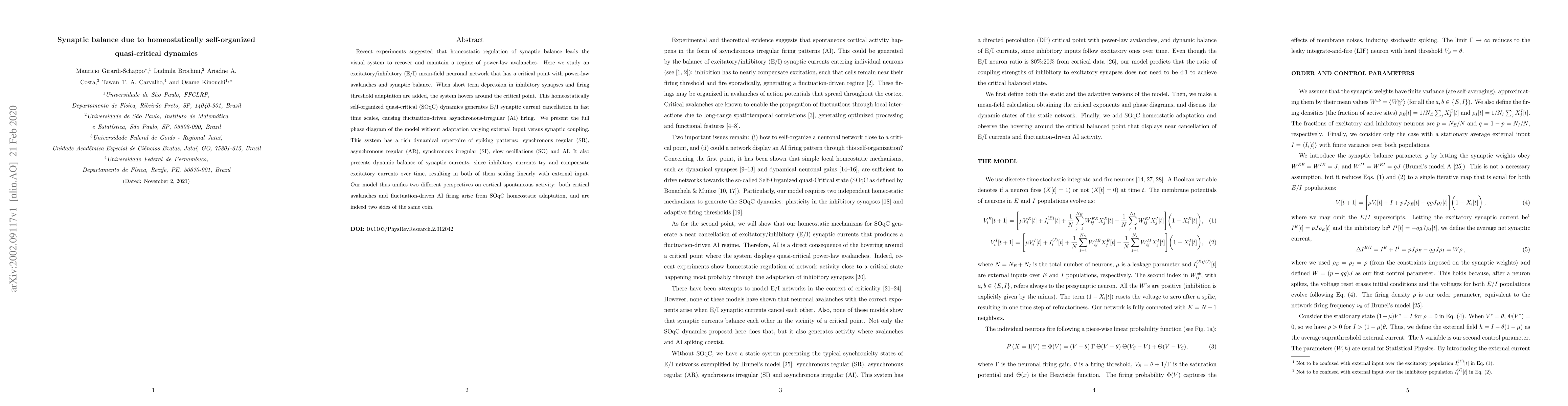 This paper investigates a mean-field neuronal network that exhibits homeostatically self-organized quasi-critical dynamics, leading to synaptic balance and recovery of power-law avalanches in the visual system. The model demonstrates a rich variety of spiking patterns and dynamic balance of synaptic currents, suggesting that criticality and asynchronous irregular firing are unified by homeostatic adaptation.