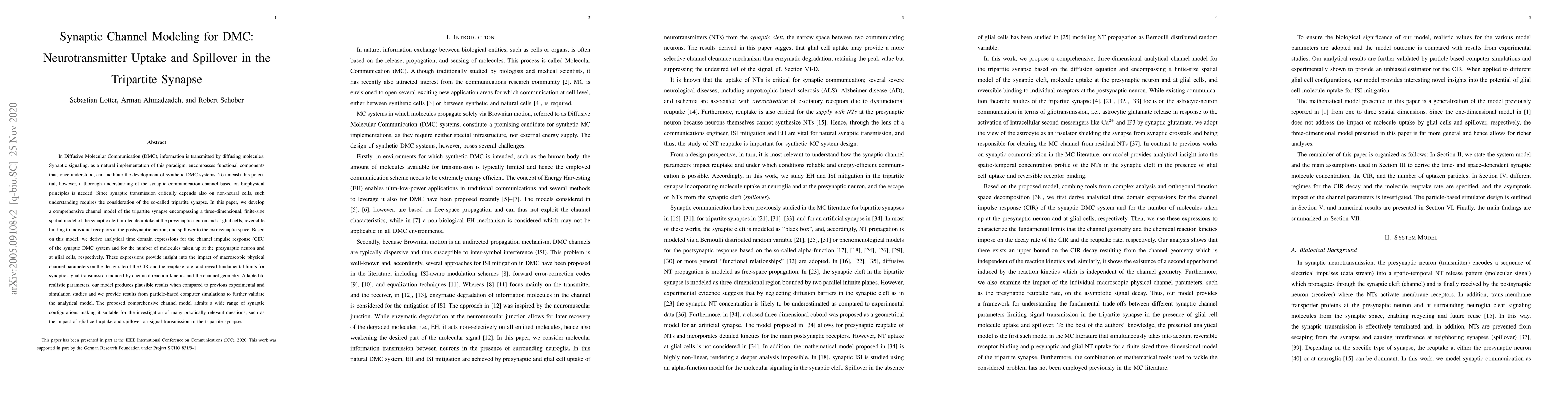 This paper develops a detailed channel model for the tripartite synapse in Diffusive Molecular Communication, incorporating neurotransmitter uptake, reversible binding, and spillover. Analytical expressions for the channel impulse response and molecule uptake rates are derived, offering insights into synaptic signal transmission limits and validating the model with simulations.