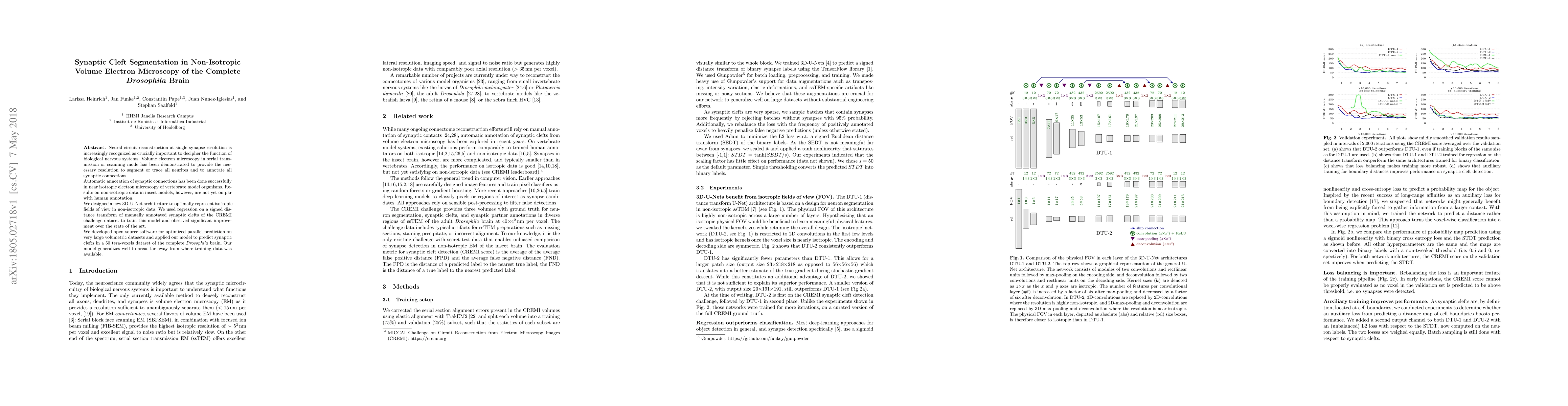This paper presents a new 3D-U-Net architecture for segmenting synaptic clefts in non-isotropic volume electron microscopy data of the Drosophila brain, achieving significant improvements over existing methods. The model was trained using a signed distance transform and applied to a large-scale dataset, demonstrating effective generalization.