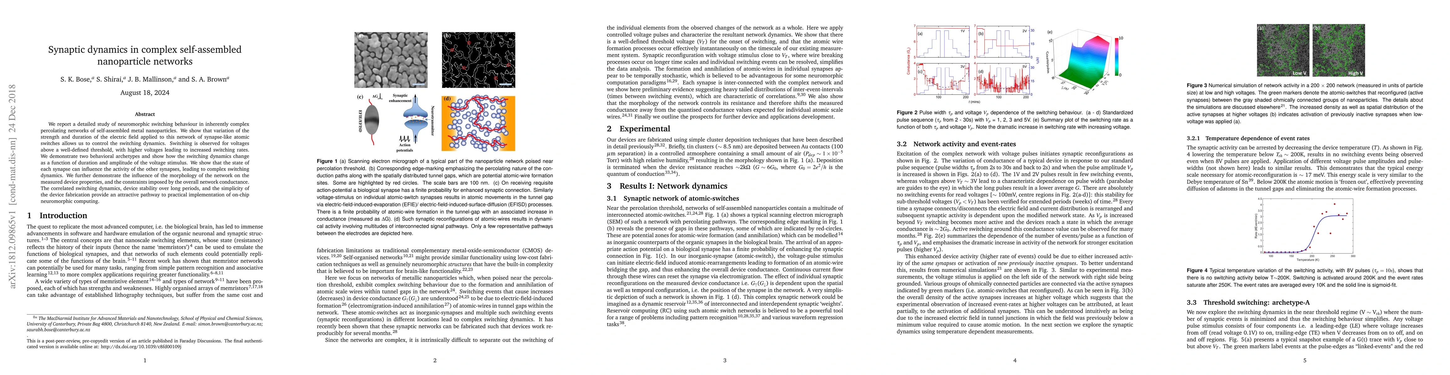 We report a detailed study of neuromorphic switching behaviour in inherently complex percolating networks of self-assembled metal nanoparticles. We show that variation of the strength and duration of the electric field applied to this network of synapse-like atomic switches allows us to control the switching dynamics. Switching is observed for voltages above a well-defined threshold, with higher voltages leading to increased switching rates. We demonstrate two behavioral archetypes and show how the switching dynamics change as a function of duration and amplitude of the voltage stimulus. We show that the state of each synapse can influence the activity of the other synapses, leading to complex switching dynamics. We further demonstrate the influence of the morphology of the network on the measured device properties, and the constraints imposed by the overall network conductance. The correlated switching dynamics, device stability over long periods, and the simplicity of the device fabrication provide an attractive pathway to practical implementation of on-chip neuromorphic computing.