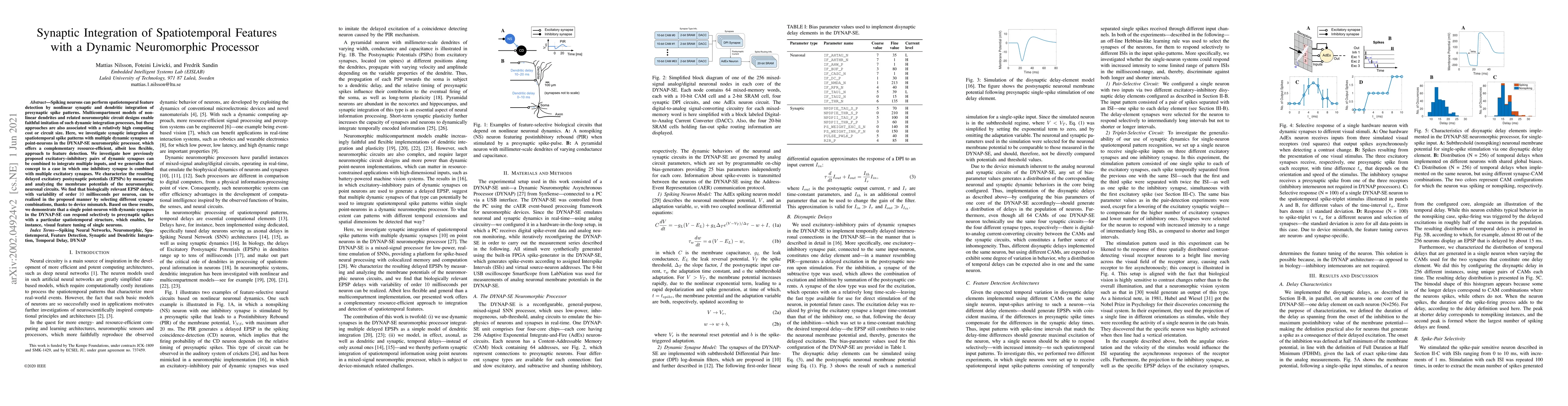 Spiking neurons can perform spatiotemporal feature detection by nonlinear synaptic and dendritic integration of presynaptic spike patterns. Multicompartment models of non-linear dendrites and related neuromorphic circuit designs enable faithful imitation of such dynamic integration processes, but these approaches are also associated with a relatively high computing cost or circuit size. Here, we investigate synaptic integration of spatiotemporal spike patterns with multiple dynamic synapses on point-neurons in the DYNAP-SE neuromorphic processor, which offers a complementary resource-efficient, albeit less flexible, approach to feature detection. We investigate how previously proposed excitatory--inhibitory pairs of dynamic synapses can be combined to integrate multiple inputs, and we generalize that concept to a case in which one inhibitory synapse is combined with multiple excitatory synapses. We characterize the resulting delayed excitatory postsynaptic potentials (EPSPs) by measuring and analyzing the membrane potentials of the neuromorphic neuronal circuits. We find that biologically relevant EPSP delays, with variability of order 10 milliseconds per neuron, can be realized in the proposed manner by selecting different synapse combinations, thanks to device mismatch. Based on these results, we demonstrate that a single point-neuron with dynamic synapses in the DYNAP-SE can respond selectively to presynaptic spikes with a particular spatiotemporal structure, which enables, for instance, visual feature tuning of single neurons.