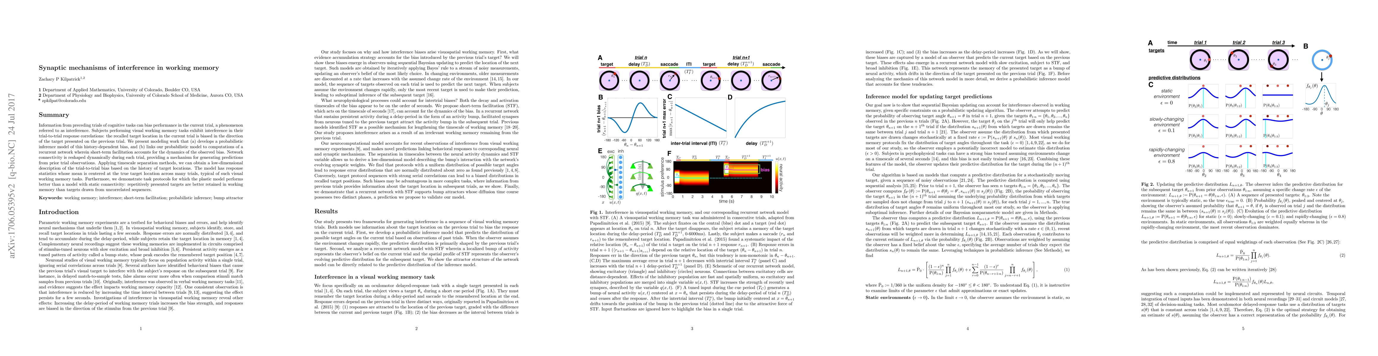 Information from preceding trials of cognitive tasks can bias performance in the current trial, a phenomenon referred to as interference. Subjects performing visual working memory tasks exhibit interference in their trial-to-trial response correlations: the recalled target location in the current trial is biased in the direction of the target presented on the previous trial. We present modeling work that (a) develops a probabilistic inference model of this history-dependent bias, and (b) links our probabilistic model to computations of a recurrent network wherein short-term facilitation accounts for the dynamics of the observed bias. Network connectivity is reshaped dynamically during each trial, providing a mechanism for generating predictions from prior trial observations. Applying timescale separation methods, we can obtain a low-dimensional description of the trial-to-trial bias based on the history of target locations. The model has response statistics whose mean is centered at the true target location across many trials, typical of such visual working memory tasks. Furthermore, we demonstrate task protocols for which the plastic model performs better than a model with static connectivity: repetitively presented targets are better retained in working memory than targets drawn from uncorrelated sequences.