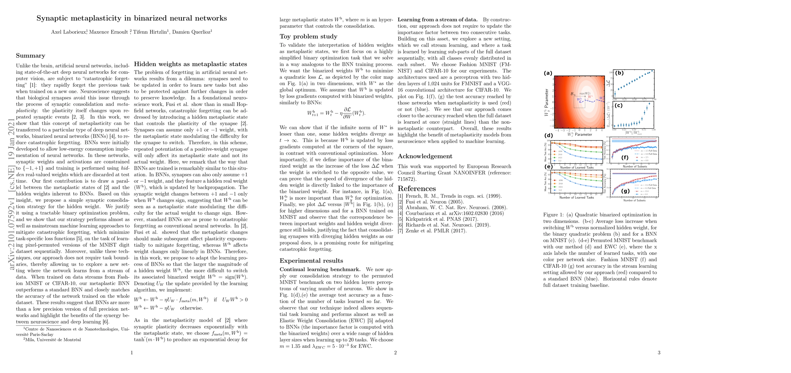 This paper explores how synaptic metaplasticity, a biological process that modulates synaptic plasticity over time, can be implemented in binarized neural networks to mitigate catastrophic forgetting when switching between tasks. The results suggest that incorporating metaplasticity principles can enhance the adaptability of neural networks.