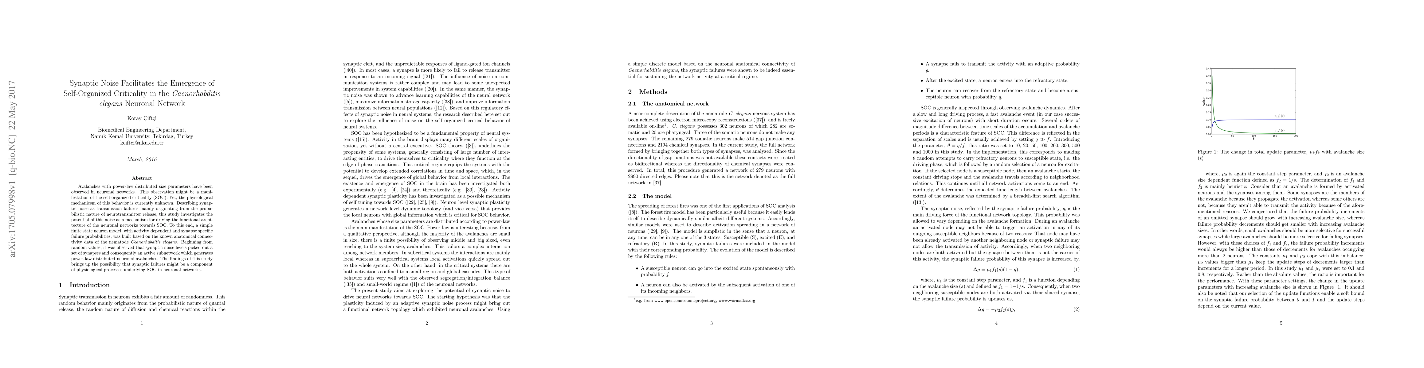 Avalanches with power-law distributed size parameters have been observed in neuronal networks. This observation might be a manifestation of the self-organized criticality (SOC). Yet, the physiological mechanicsm of this behavior is currently unknown. Describing synaptic noise as transmission failures mainly originating from the probabilistic nature of neurotransmitter release, this study investigates the potential of this noise as a mechanism for driving the functional architecture of the neuronal networks towards SOC. To this end, a simple finite state neuron model, with activity dependent and synapse specific failure probabilities, was built based on the known anatomical connectivity data of the nematode Ceanorhabditis elegans. Beginning from random values, it was observed that synaptic noise levels picked out a set of synapses and consequently an active subnetwork which generates power-law distributed neuronal avalanches. The findings of this study brings up the possibility that synaptic failures might be a component of physiological processes underlying SOC in neuronal networks.