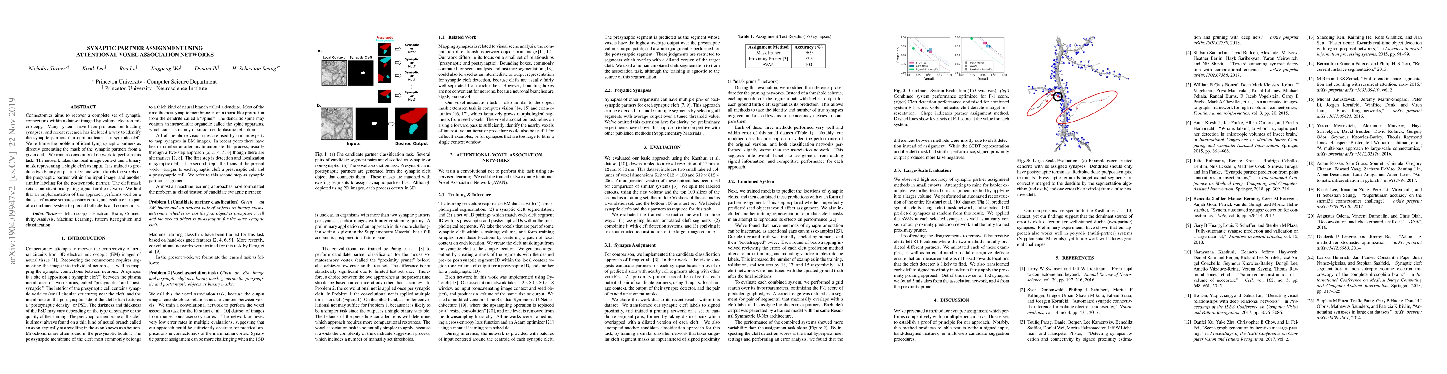 This paper proposes a convolutional network to identify synaptic partners by generating masks for presynaptic and postsynaptic partners from a given synaptic cleft, using local image context and cleft masks as inputs. The method is shown to perform well on a mouse somatosensory cortex dataset and is integrated into a system for predicting synaptic clefts and connections.