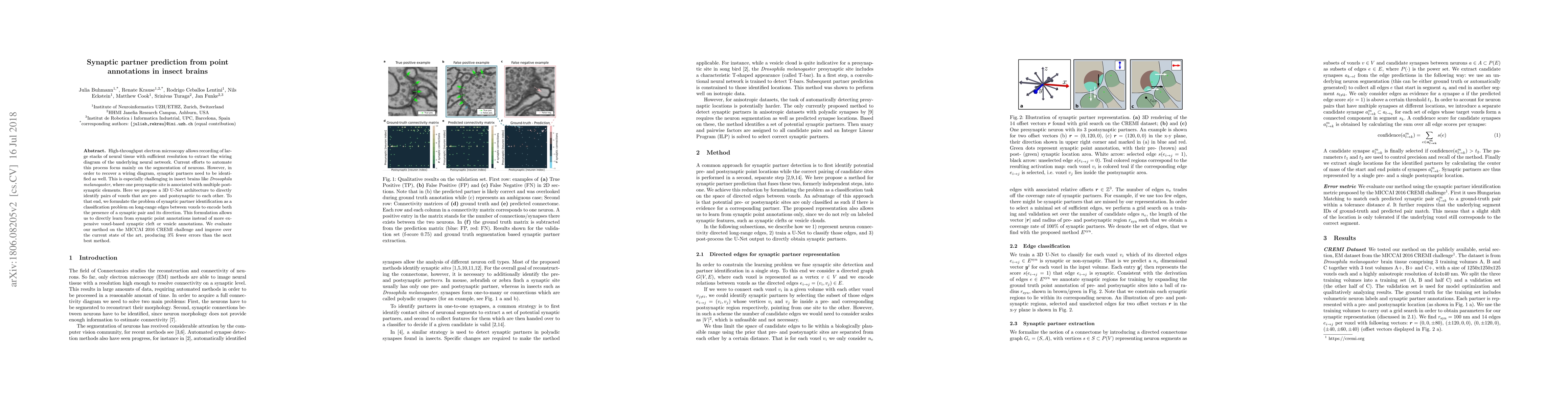 This paper proposes a 3D U-Net architecture to automate the identification of synaptic partners in insect brains using high-resolution electron microscopy. The method formulates synaptic partner prediction as a classification problem, achieving state-of-the-art results on the MICCAI 2016 CREMI challenge with 3% fewer errors than the previous best method.