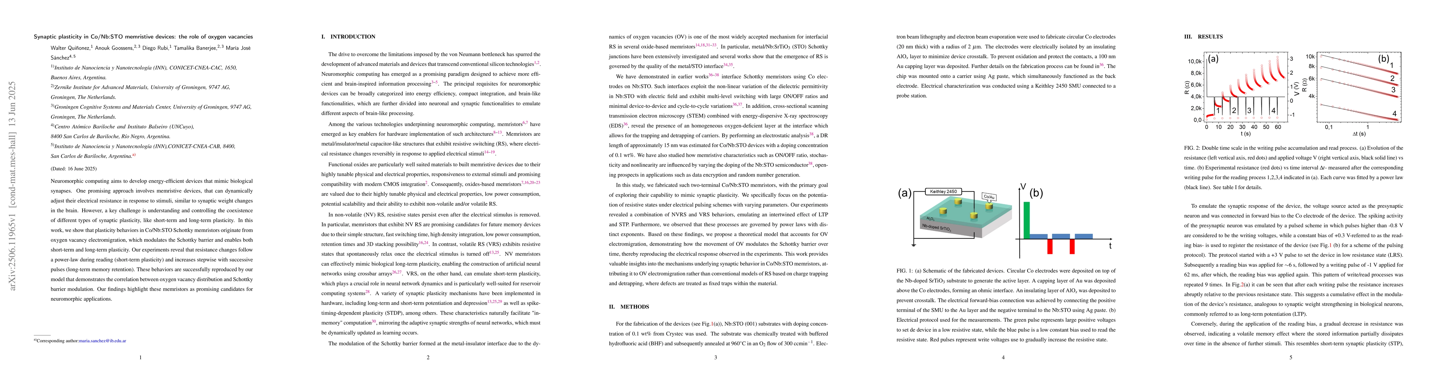 The research demonstrates that synaptic plasticity in Co/Nb:STO memristive devices stems from oxygen vacancy electromigration, enabling both short-term and long-term plasticity. Experiments and modeling show power-law resistance changes for short-term plasticity and stepwise increases for long-term memory retention, positioning these devices as potential neuromorphic computing components.
