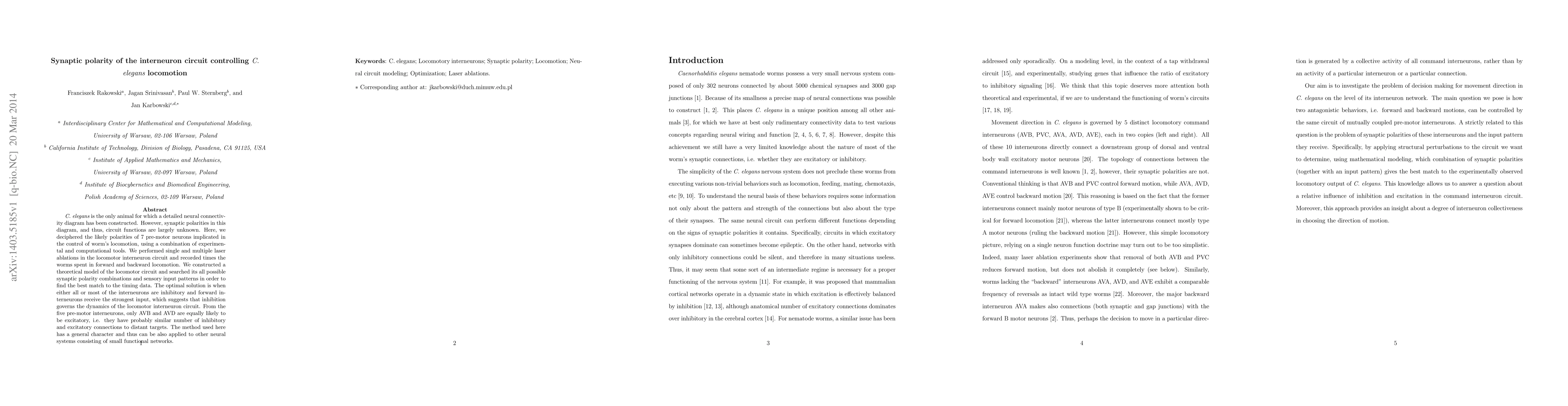 C. elegans is the only animal for which a detailed neural connectivity diagram has been constructed. However, synaptic polarities in this diagram, and thus, circuit functions are largely unknown. Here, we deciphered the likely polarities of 7 pre-motor neurons implicated in the control of worm's locomotion, using a combination of experimental and computational tools. We performed single and multiple laser ablations in the locomotor interneuron circuit and recorded times the worms spent in forward and backward locomotion. We constructed a theoretical model of the locomotor circuit and searched its all possible synaptic polarity combinations and sensory input patterns in order to find the best match to the timing data. The optimal solution is when either all or most of the interneurons are inhibitory and forward interneurons receive the strongest input, which suggests that inhibition governs the dynamics of the locomotor interneuron circuit. From the five pre-motor interneurons, only AVB and AVD are equally likely to be excitatory, i.e. they have probably similar number of inhibitory and excitatory connections to distant targets. The method used here has a general character and thus can be also applied to other neural systems consisting of small functional networks.