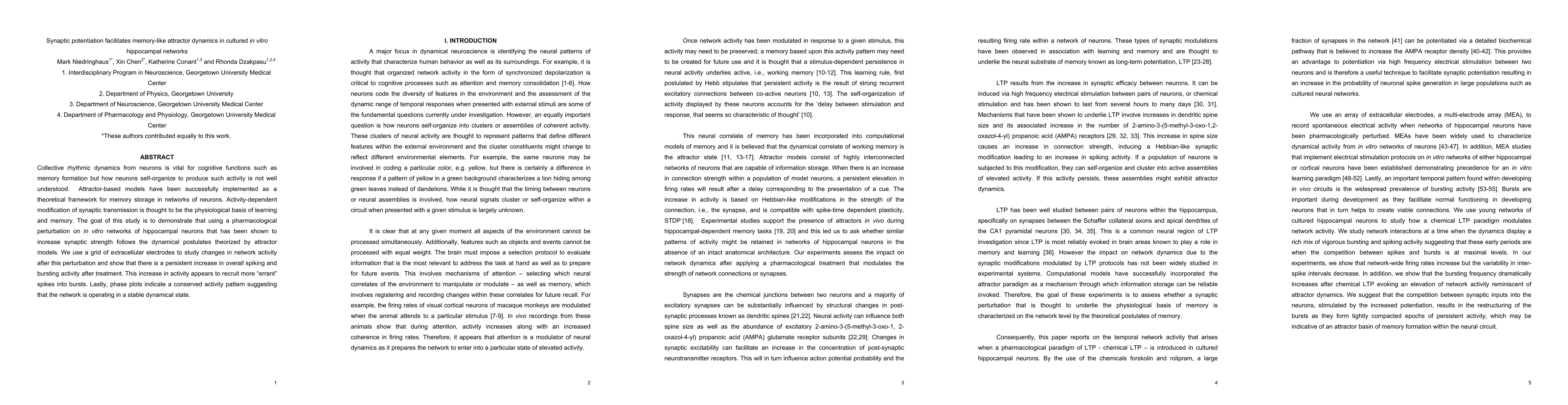 Synaptic potentiation in cultured hippocampal neurons increases overall spiking and bursting activity, suggesting a stable dynamic state similar to attractor models of memory storage. The increase in activity recruits more errant spikes into bursts, potentially facilitating memory-like dynamics.