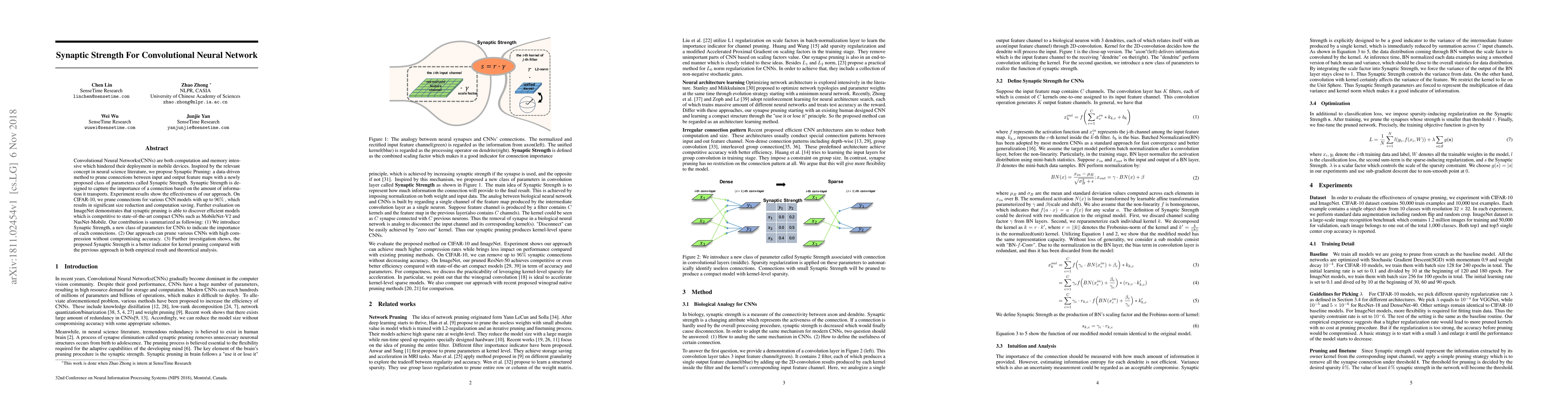 Convolutional Neural Networks(CNNs) are both computation and memory intensive which hindered their deployment in mobile devices. Inspired by the relevant concept in neural science literature, we propose Synaptic Pruning: a data-driven method to prune connections between input and output feature maps with a newly proposed class of parameters called Synaptic Strength. Synaptic Strength is designed to capture the importance of a connection based on the amount of information it transports. Experiment results show the effectiveness of our approach. On CIFAR-10, we prune connections for various CNN models with up to 96% , which results in significant size reduction and computation saving. Further evaluation on ImageNet demonstrates that synaptic pruning is able to discover efficient models which is competitive to state-of-the-art compact CNNs such as MobileNet-V2 and NasNet-Mobile. Our contribution is summarized as following: (1) We introduce Synaptic Strength, a new class of parameters for CNNs to indicate the importance of each connections. (2) Our approach can prune various CNNs with high compression without compromising accuracy. (3) Further investigation shows, the proposed Synaptic Strength is a better indicator for kernel pruning compared with the previous approach in both empirical result and theoretical analysis.