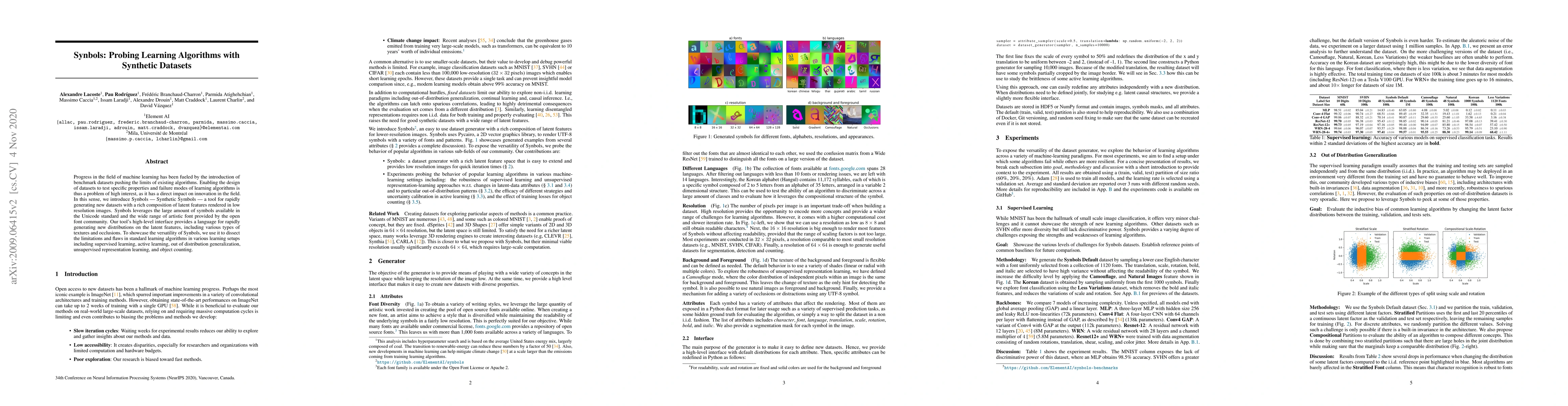 Progress in the field of machine learning has been fueled by the introduction of benchmark datasets pushing the limits of existing algorithms. Enabling the design of datasets to test specific properties and failure modes of learning algorithms is thus a problem of high interest, as it has a direct impact on innovation in the field. In this sense, we introduce Synbols -- Synthetic Symbols -- a tool for rapidly generating new datasets with a rich composition of latent features rendered in low resolution images. Synbols leverages the large amount of symbols available in the Unicode standard and the wide range of artistic font provided by the open font community. Our tool's high-level interface provides a language for rapidly generating new distributions on the latent features, including various types of textures and occlusions. To showcase the versatility of Synbols, we use it to dissect the limitations and flaws in standard learning algorithms in various learning setups including supervised learning, active learning, out of distribution generalization, unsupervised representation learning, and object counting.