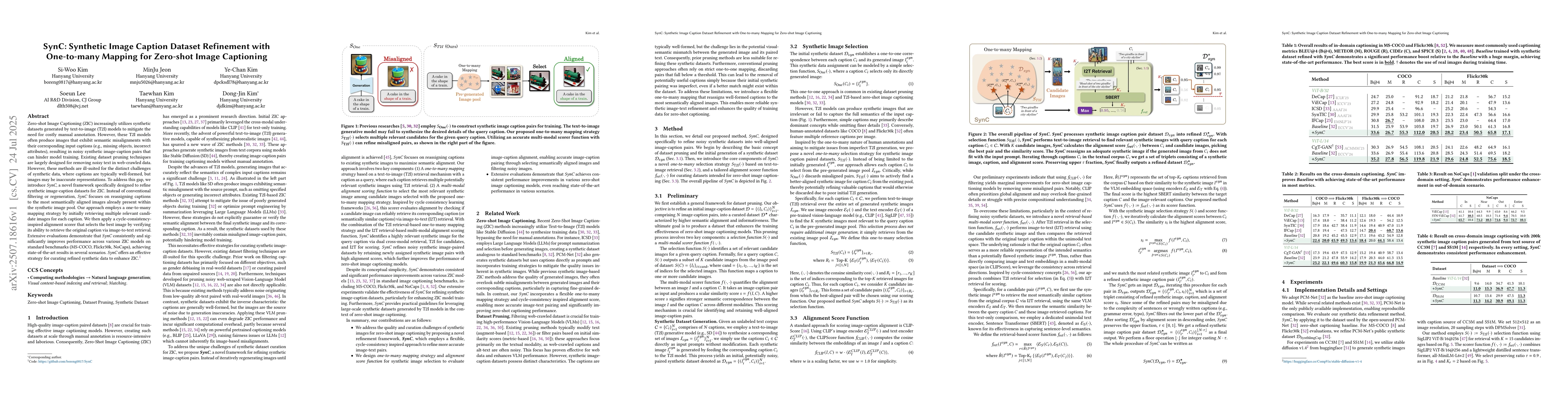 Zero-shot Image Captioning (ZIC) increasingly utilizes synthetic datasets generated by text-to-image (T2I) models to mitigate the need for costly manual annotation. However, these T2I models often produce images that exhibit semantic misalignments with their corresponding input captions (e.g., missing objects, incorrect attributes), resulting in noisy synthetic image-caption pairs that can hinder model training. Existing dataset pruning techniques are largely designed for removing noisy text in web-crawled data. However, these methods are ill-suited for the distinct challenges of synthetic data, where captions are typically well-formed, but images may be inaccurate representations. To address this gap, we introduce SynC, a novel framework specifically designed to refine synthetic image-caption datasets for ZIC. Instead of conventional filtering or regeneration, SynC focuses on reassigning captions to the most semantically aligned images already present within the synthetic image pool. Our approach employs a one-to-many mapping strategy by initially retrieving multiple relevant candidate images for each caption. We then apply a cycle-consistency-inspired alignment scorer that selects the best image by verifying its ability to retrieve the original caption via image-to-text retrieval. Extensive evaluations demonstrate that SynC consistently and significantly improves performance across various ZIC models on standard benchmarks (MS-COCO, Flickr30k, NoCaps), achieving state-of-the-art results in several scenarios. SynC offers an effective strategy for curating refined synthetic data to enhance ZIC.
