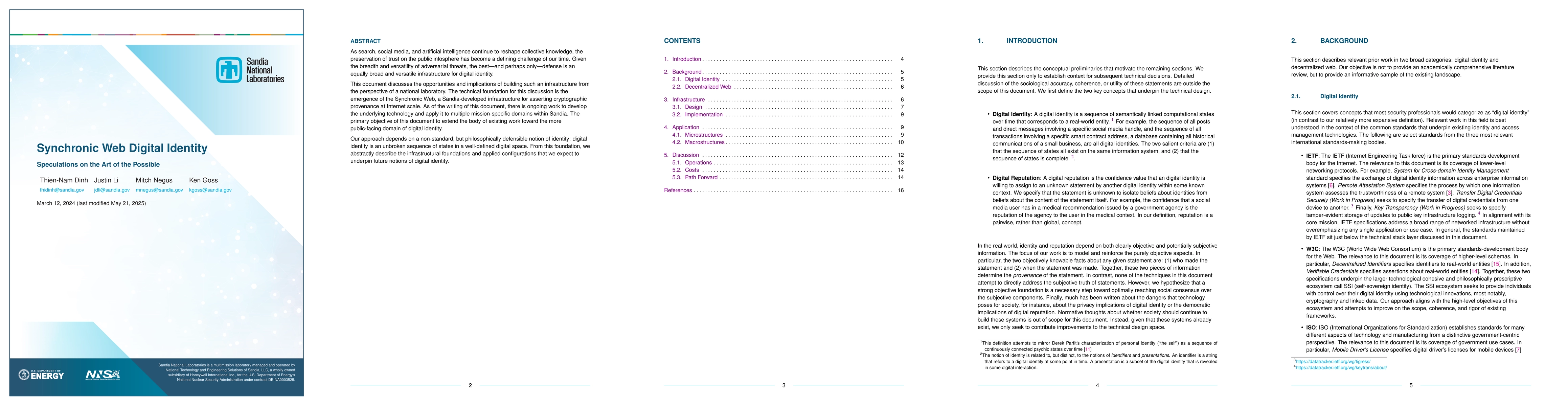 As search, social media, and artificial intelligence continue to reshape collective knowledge, the preservation of trust on the public infosphere has become a defining challenge of our time. Given the breadth and versatility of adversarial threats, the best--and perhaps only--defense is an equally broad and versatile infrastructure for digital identity. This document discusses the opportunities and implications of building such an infrastructure from the perspective of a national laboratory. The technical foundation for this discussion is the emergence of the Synchronic Web, a Sandia-developed infrastructure for asserting cryptographic provenance at Internet scale. As of the writing of this document, there is ongoing work to develop the underlying technology and apply it to multiple mission-specific domains within Sandia. The primary objective of this document to extend the body of existing work toward the more public-facing domain of digital identity. Our approach depends on a non-standard, but philosophically defensible notion of identity: digital identity is an unbroken sequence of states in a well-defined digital space. From this foundation, we abstractly describe the infrastructural foundations and applied configurations that we expect to underpin future notions of digital identity.