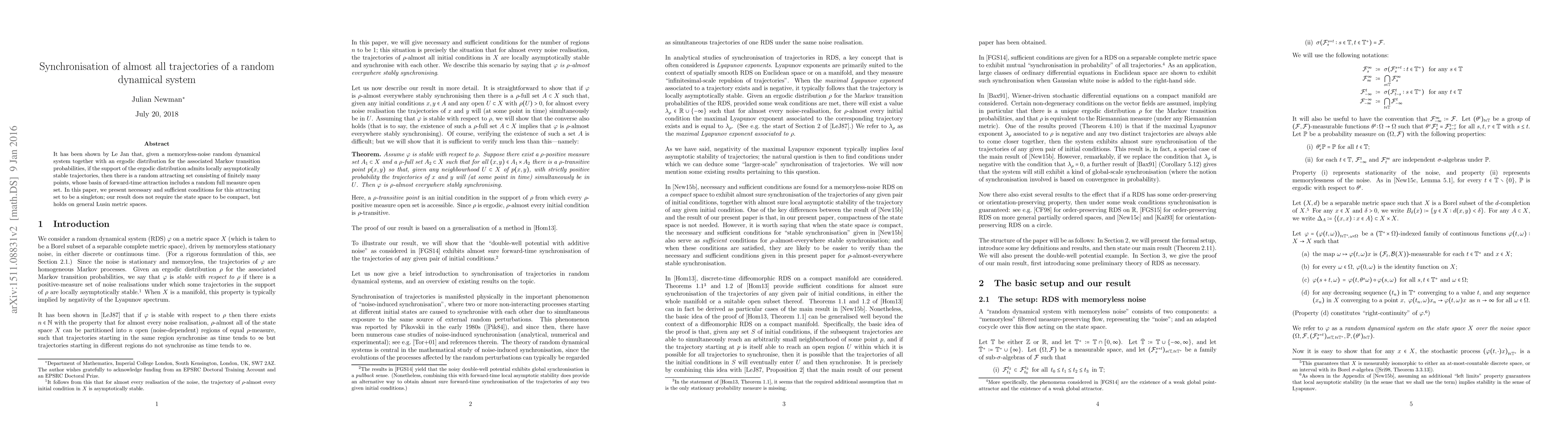 It has been shown by Le Jan that, given a memoryless-noise random dynamical system together with an ergodic distribution for the associated Markov transition probabilities, if the support of the ergodic distribution admits locally asymptotically stable trajectories, then there is a random attracting set consisting of finitely many points, whose basin of forward-time attraction includes a random full measure open set. In this paper, we present necessary and sufficient conditions for this attracting set to be a singleton; our result does not require the state space to be compact, but holds on general Lusin metric spaces.