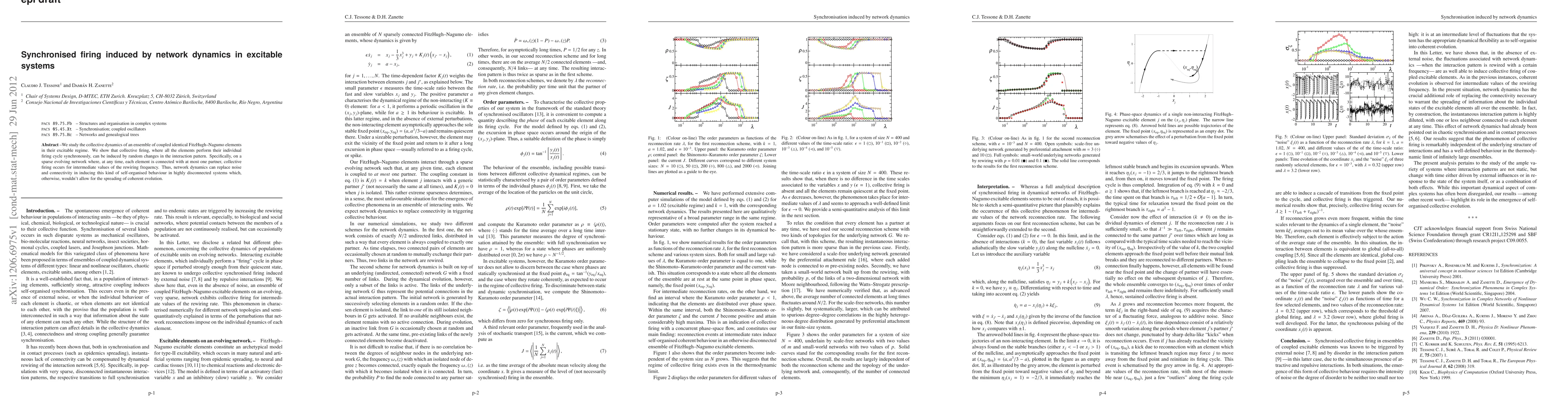 A study on coupled FitzHugh-Nagumo elements shows that collective firing can be induced by random changes in the interaction pattern, allowing highly disconnected systems to exhibit self-organized behavior.