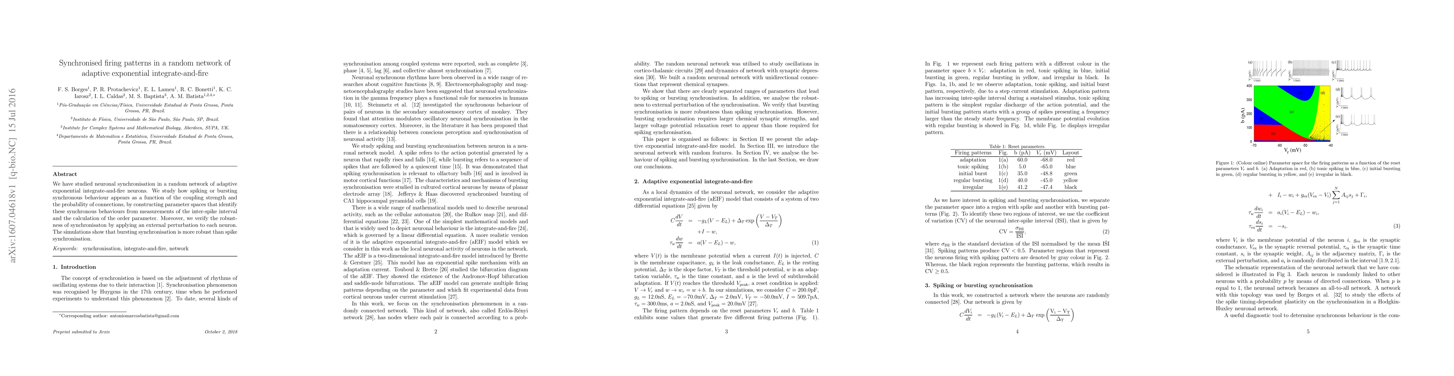 This paper investigates the synchronisation patterns in a random network of adaptive exponential integrate-and-fire neurons, identifying how spiking and bursting synchronisation emerge with varying coupling strength and connection probability. The study finds that bursting synchronisation is more robust than spike synchronisation, even under external perturbations.