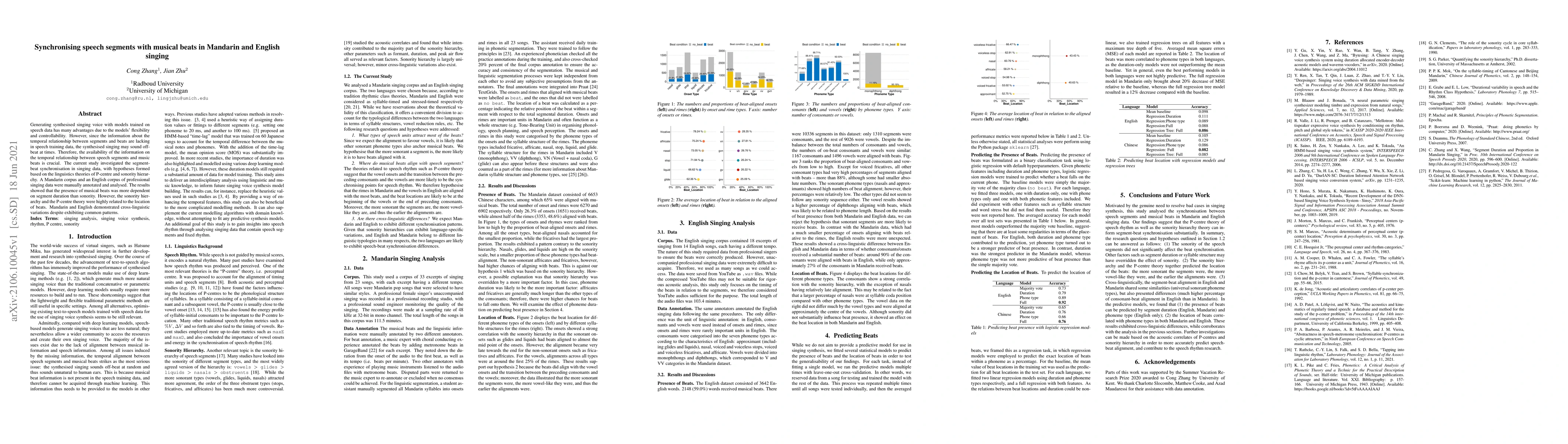 This study investigates the temporal relationship between speech segments and musical beats in Mandarin and English singing, focusing on segment-beat synchronisation. Findings indicate that musical beats are more influenced by segment duration than sonority, while sonority hierarchy and P-centre theory significantly affect beat location, revealing cross-linguistic variations despite common patterns.