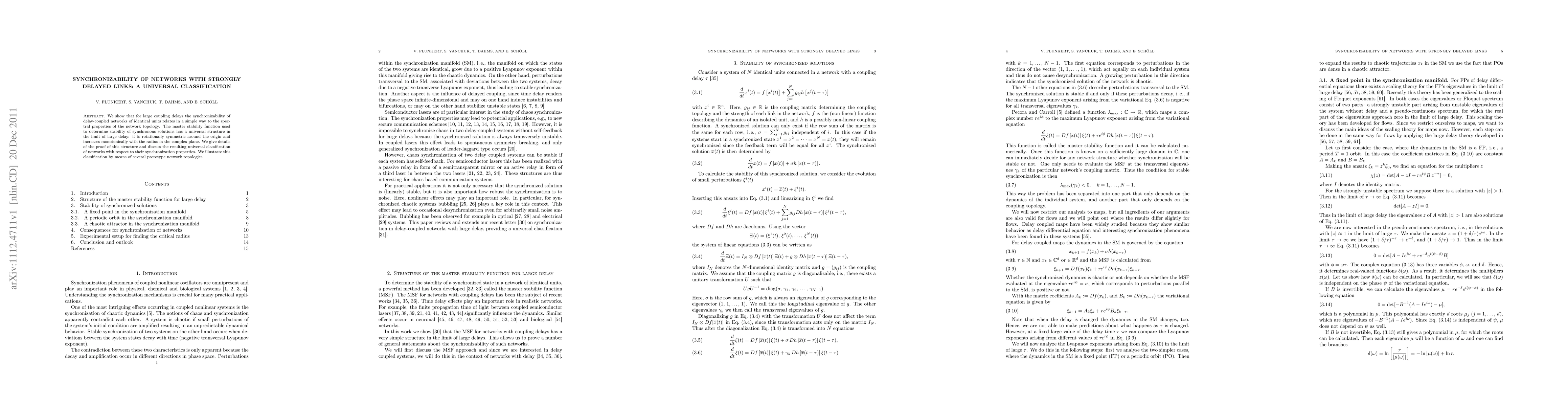 We show that for large coupling delays the synchronizability of delay-coupled networks of identical units relates in a simple way to the spectral properties of the network topology. The master stability function used to determine stability of synchronous solutions has a universal structure in the limit of large delay: it is rotationally symmetric around the origin and increases monotonically with the radius in the complex plane. We give details of the proof of this structure and discuss the resulting universal classification of networks with respect to their synchronization properties. We illustrate this classification by means of several prototype network topologies.