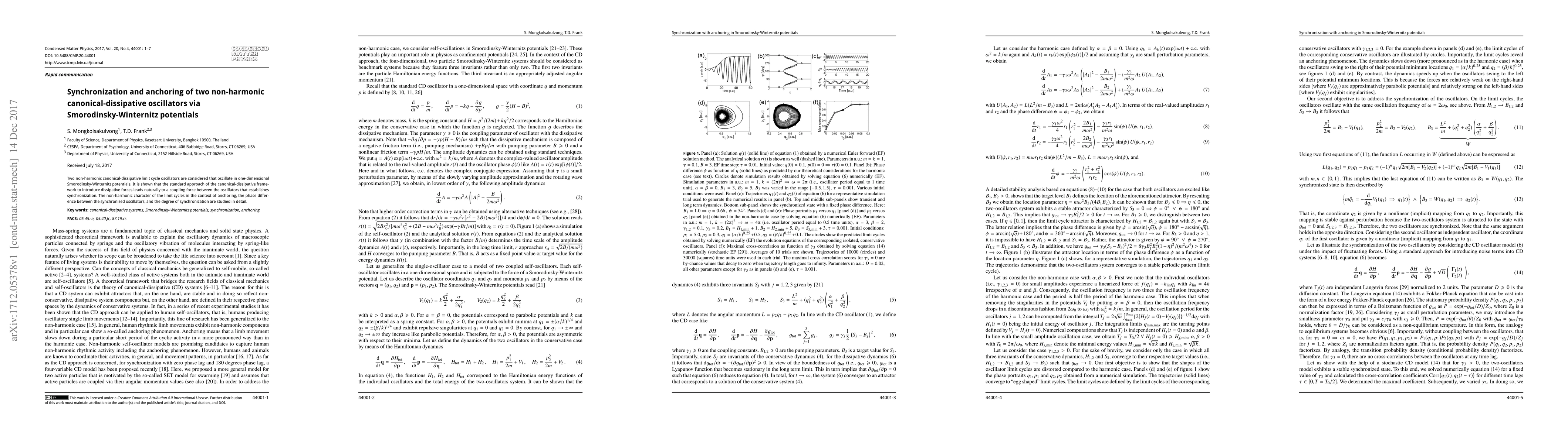 Two non-harmonic canonical-dissipative limit cycle oscillators are considered that oscillate in one-dimensional Smorodinsky-Winternitz potentials. It is shown that the standard approach of the canonical-dissipative framework to introduce dissipative forces leads naturally to a coupling force between the oscillators that establishes synchronization. The non-harmonic character of the limit cycles in the context of anchoring, the phase difference between the synchronized oscillators, and the degree of synchronization are studied in detail.