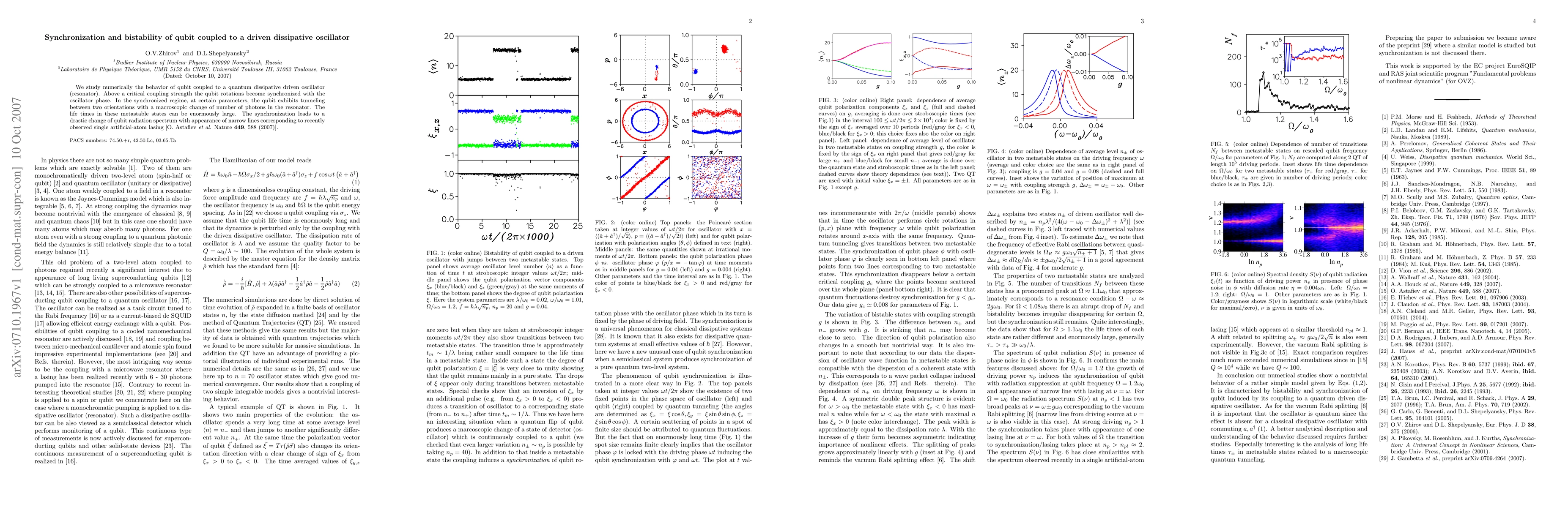 We study numerically the behavior of qubit coupled to a quantum dissipative driven oscillator (resonator). Above a critical coupling strength the qubit rotations become synchronized with the oscillator phase. In the synchronized regime, at certain parameters, the qubit exhibits tunneling between two orientations with a macroscopic change of number of photons in the resonator. The life times in these metastable states can be enormously large. The synchronization leads to a drastic change of qubit radiation spectrum with appearance of narrow lines corresponding to recently observed single artificial-atom lasing [O. Astafiev {\it et al.} Nature {\bf 449}, 588 (2007)].