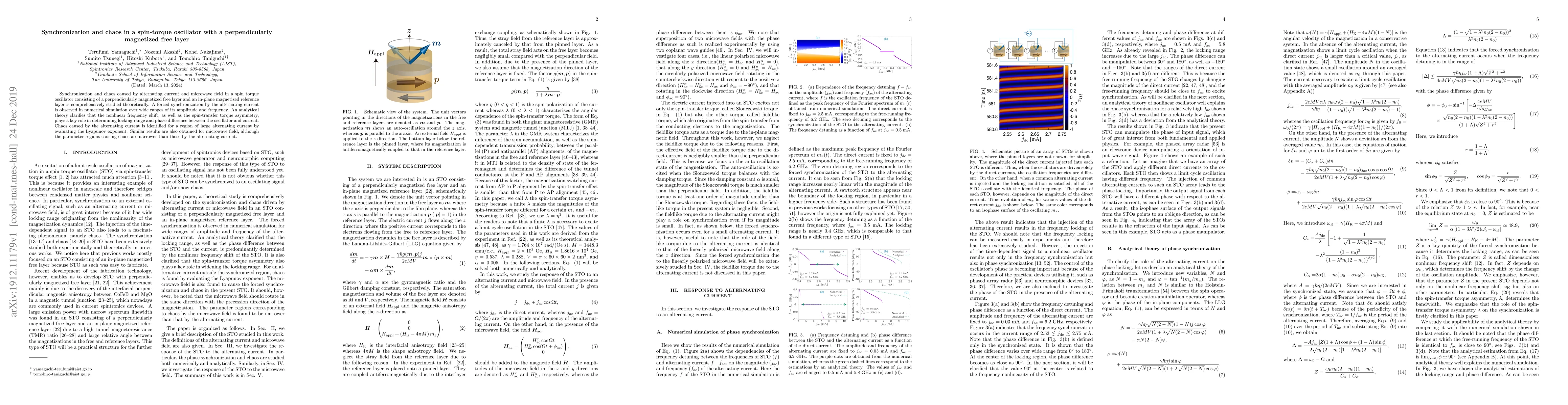 This paper investigates synchronization and chaos in a spin-torque oscillator with a perpendicularly magnetized free layer under the influence of alternating current and microwave fields. Numerical simulations reveal forced synchronization, while analytical theory identifies nonlinear frequency shift and spin-transfer torque asymmetry as key factors in determining locking range and phase difference. Chaos is observed in the system under large alternating current, as evidenced by the Lyapunov exponent.