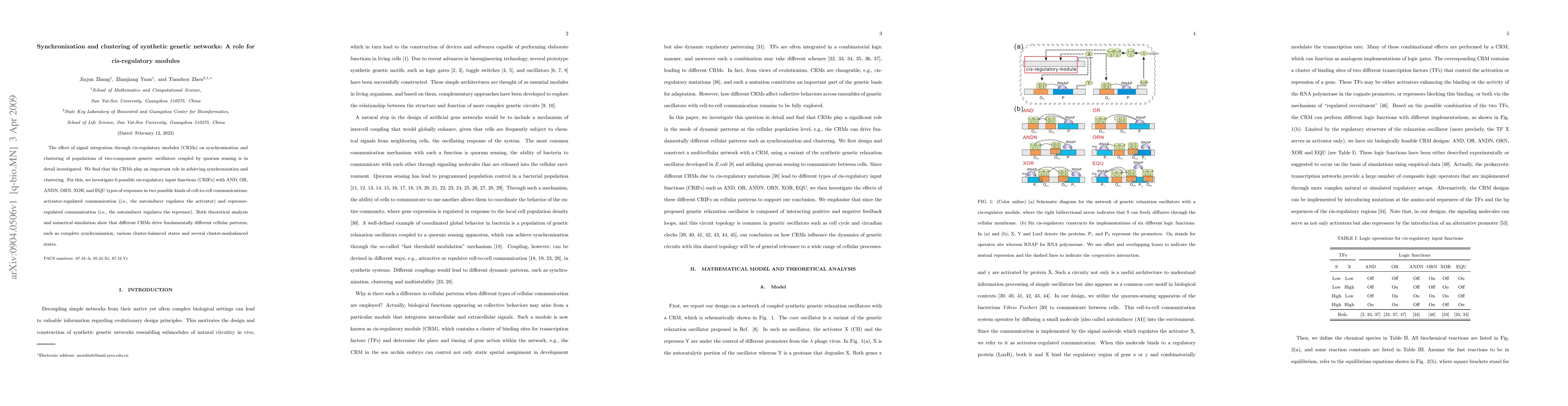 This paper investigates how cis-regulatory modules (CRMs) influence synchronization and clustering in populations of two-component genetic oscillators linked via quorum sensing. Theoretical and simulation results reveal that different CRMs lead to distinct cellular patterns, including complete synchronization and various clustering states.