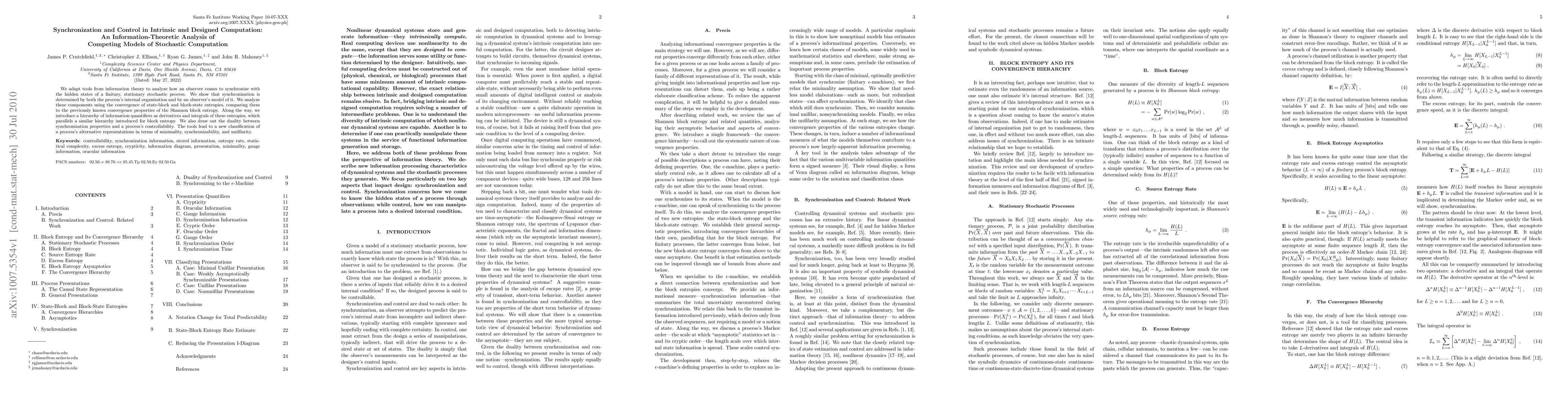 We adapt tools from information theory to analyze how an observer comes to synchronize with the hidden states of a finitary, stationary stochastic process. We show that synchronization is determined by both the process's internal organization and by an observer's model of it. We analyze these components using the convergence of state-block and block-state entropies, comparing them to the previously known convergence properties of the Shannon block entropy. Along the way, we introduce a hierarchy of information quantifiers as derivatives and integrals of these entropies, which parallels a similar hierarchy introduced for block entropy. We also draw out the duality between synchronization properties and a process's controllability. The tools lead to a new classification of a process's alternative representations in terms of minimality, synchronizability, and unifilarity.