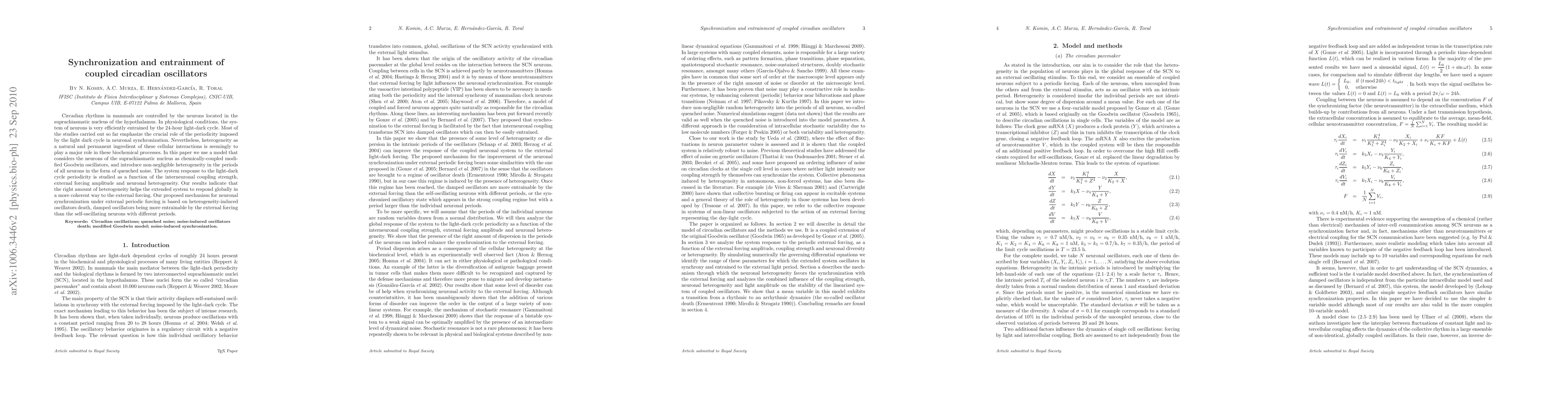 This paper models circadian oscillators in the suprachiasmatic nucleus as chemically-coupled Goodwin oscillators, introducing heterogeneity to study synchronization under external light-dark cycles. It finds that moderate heterogeneity enhances global coherence and synchronization through heterogeneity-induced oscillator death, making damped oscillators more entrainable.