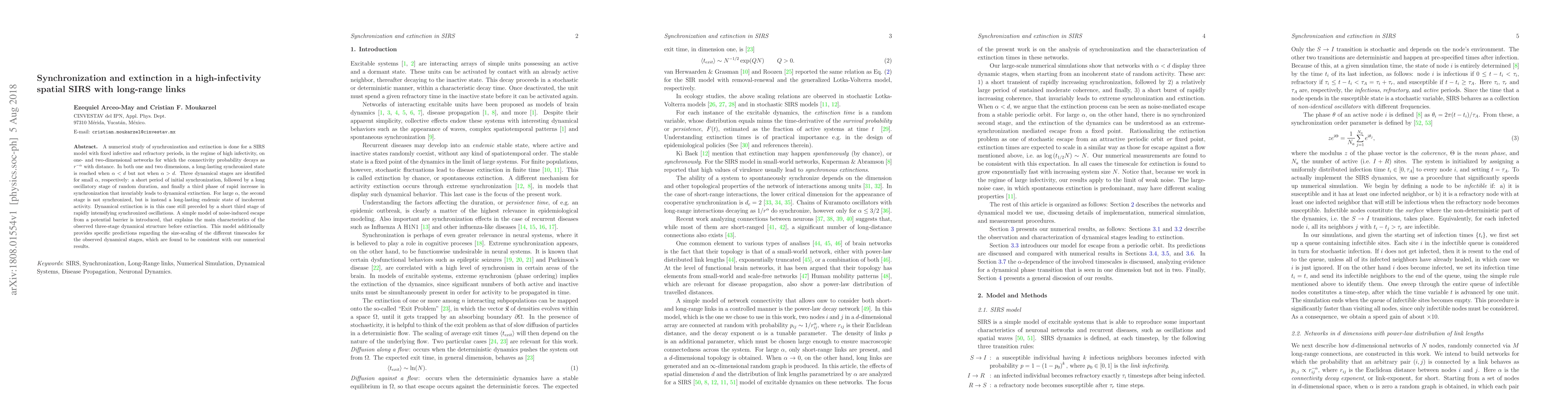 This paper investigates synchronization and extinction in a high-infectivity SIRS model on networks with long-range connections, finding that synchronization occurs when the decay rate of connectivity is less than the dimension, leading to three dynamical stages before extinction. For larger decay rates, the system remains endemic with incoherent activity.