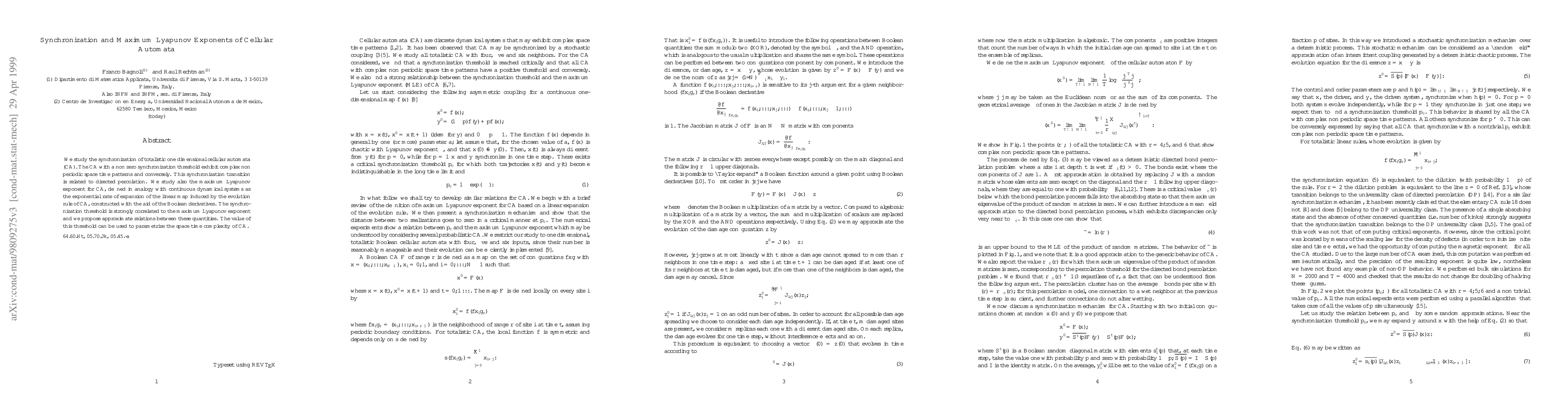 This paper explores synchronization patterns in one-dimensional cellular automata, showing a correlation between synchronization thresholds and maximum Lyapunov exponents. These findings offer insights into the complex behavior of CA systems.