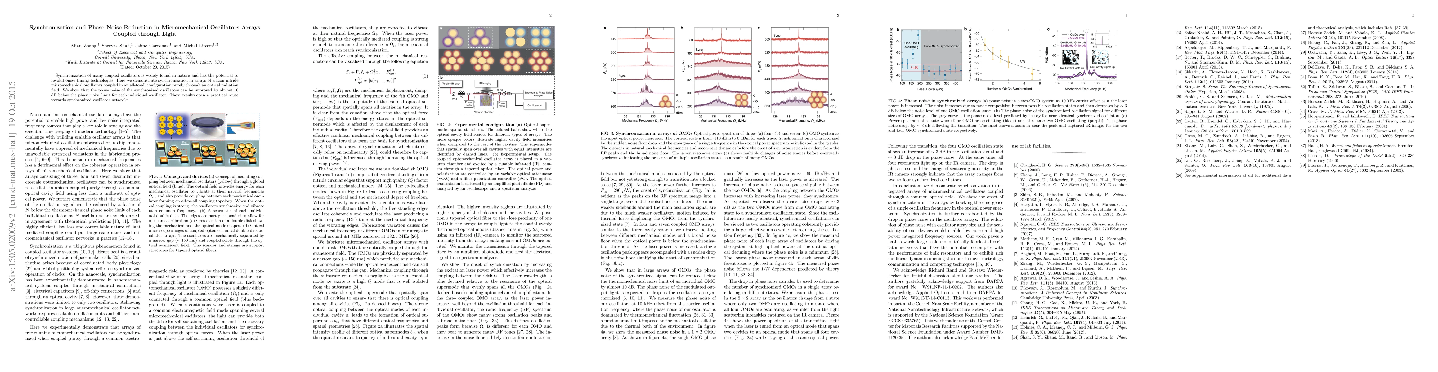 This paper demonstrates synchronization in arrays of silicon nitride micromechanical oscillators coupled via optical radiation, achieving a significant reduction in phase noise by nearly 10 dB below the individual oscillator limit, paving the way for advanced synchronized oscillator networks.