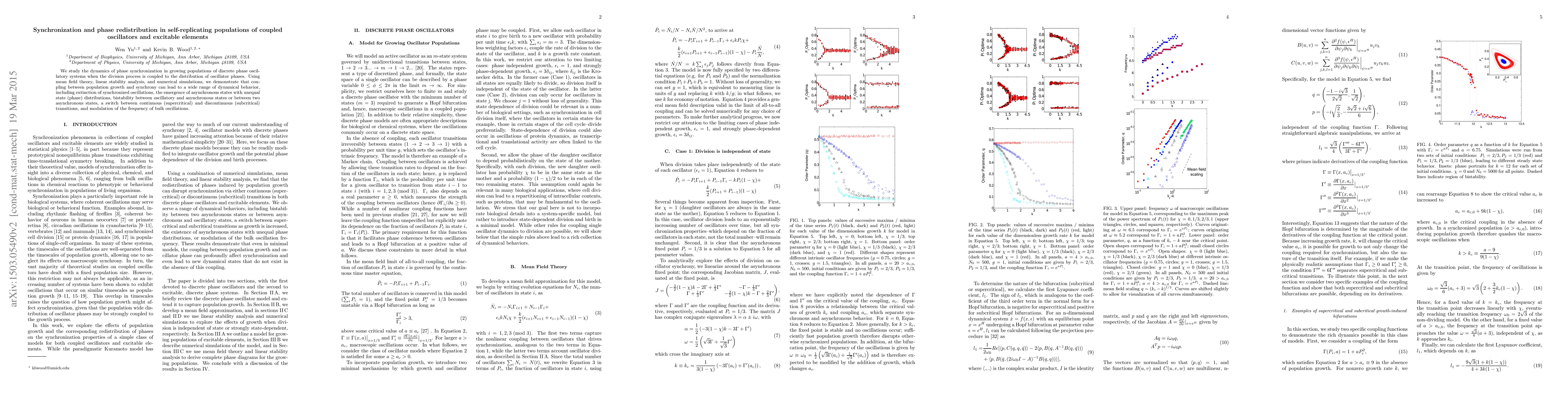 We study the dynamics of phase synchronization in growing populations of discrete phase oscillatory systems when the division process is coupled to the distribution of oscillator phases. Using mean field theory, linear stability analysis, and numerical simulations, we demonstrate that coupling between population growth and synchrony can lead to a wide range of dynamical behavior, including extinction of synchronized oscillations, the emergence of asynchronous states with unequal state (phase) distributions, bistability between oscillatory and asynchronous states or between two asynchronous states, a switch between continuous (supercritical) and discontinuous (subcritical) transitions, and modulation of the frequency of bulk oscillations.