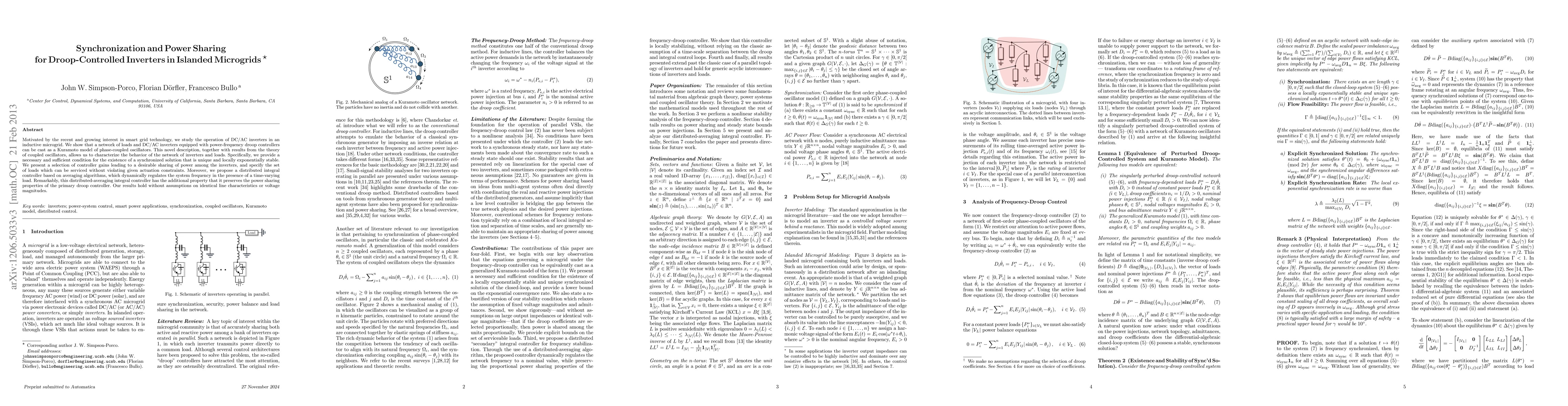 Motivated by the recent and growing interest in smart grid technology, we study the operation of DC/AC inverters in an inductive microgrid. We show that a network of loads and DC/AC inverters equipped with power-frequency droop controllers can be cast as a Kuramoto model of phase-coupled oscillators. This novel description, together with results from the theory of coupled oscillators, allows us to characterize the behavior of the network of inverters and loads. Specifically, we provide a necessary and sufficient condition for the existence of a synchronized solution that is unique and locally exponentially stable. We present a selection of controller gains leading to a desirable sharing of power among the inverters, and specify the set of loads which can be serviced without violating given actuation constraints. Moreover, we propose a distributed integral controller based on averaging algorithms which dynamically regulates the system frequency in the presence of a time-varying load. Remarkably, this distributed-averaging integral controller has the additional property that it maintains the power sharing properties of the primary droop controller. Our results hold without assumptions on identical line characteristics or voltage magnitudes.
