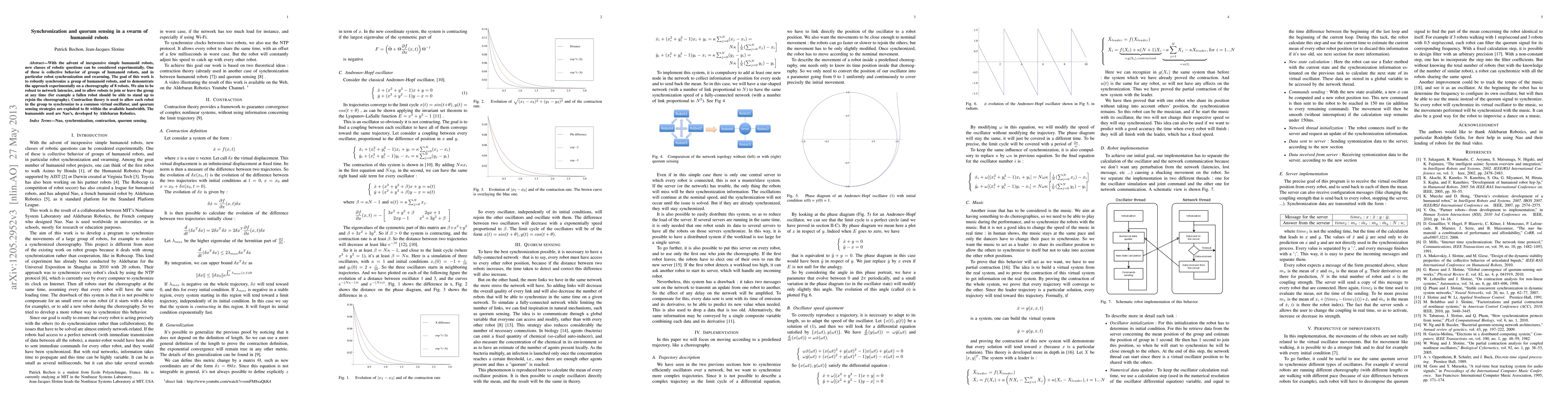With the advent of inexpensive simple humanoid robots, new classes of robotic questions can be considered experimentally. One of these is collective behavior of groups of humanoid robots, and in particular robot synchronization and swarming. The goal of this work is to robustly synchronize a group of humanoid robots, and to demonstrate the approach experimentally on a choreography of 8 robots. We aim to be robust to network latencies, and to allow robots to join or leave the group at any time (for example a fallen robot should be able to stand up to rejoin the choreography). Contraction theory is used to allow each robot in the group to synchronize to a common virtual oscillator, and quorum sensing strategies are exploited to fit within the available bandwidth. The humanoids used are Nao's, developed by Aldebaran Robotics.