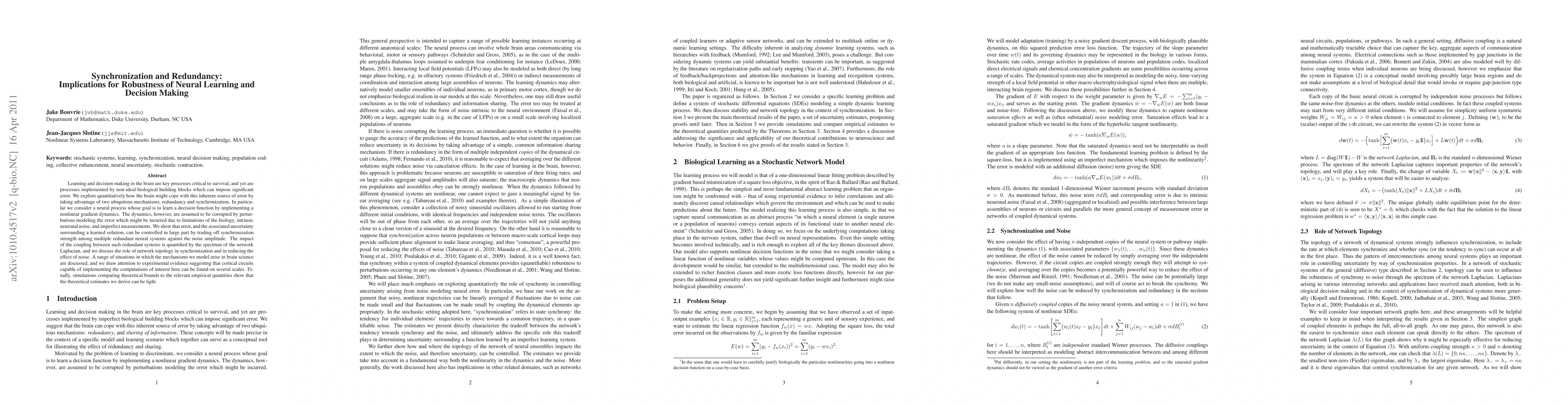 Learning and decision making in the brain are key processes critical to survival, and yet are processes implemented by non-ideal biological building blocks which can impose significant error. We explore quantitatively how the brain might cope with this inherent source of error by taking advantage of two ubiquitous mechanisms, redundancy and synchronization. In particular we consider a neural process whose goal is to learn a decision function by implementing a nonlinear gradient dynamics. The dynamics, however, are assumed to be corrupted by perturbations modeling the error which might be incurred due to limitations of the biology, intrinsic neuronal noise, and imperfect measurements. We show that error, and the associated uncertainty surrounding a learned solution, can be controlled in large part by trading off synchronization strength among multiple redundant neural systems against the noise amplitude. The impact of the coupling between such redundant systems is quantified by the spectrum of the network Laplacian, and we discuss the role of network topology in synchronization and in reducing the effect of noise. A range of situations in which the mechanisms we model arise in brain science are discussed, and we draw attention to experimental evidence suggesting that cortical circuits capable of implementing the computations of interest here can be found on several scales. Finally, simulations comparing theoretical bounds to the relevant empirical quantities show that the theoretical estimates we derive can be tight.