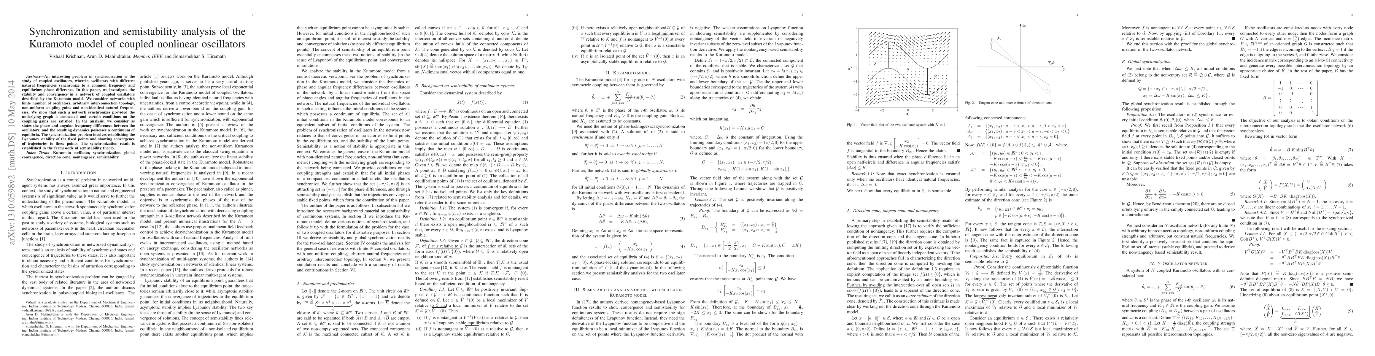 This paper investigates the synchronization and stability of the Kuramoto model in networks of coupled nonlinear oscillators with varying frequencies and coupling strengths. The study proves synchronization under connectivity conditions and semistability, focusing on the phase and frequency differences between oscillators.