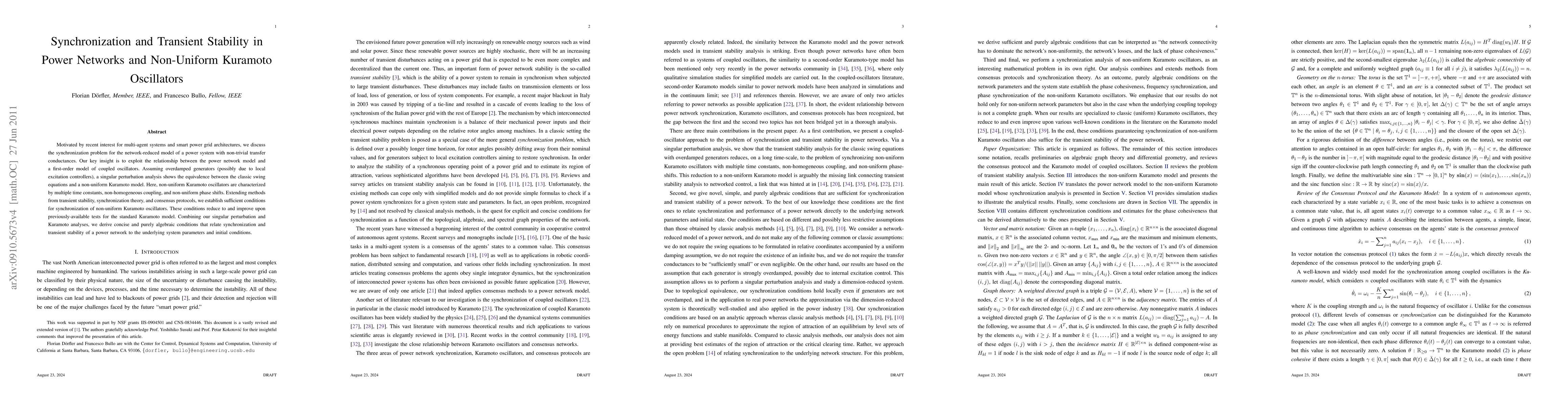 This paper explores synchronization in power networks by modeling them as non-uniform Kuramoto oscillators, establishing conditions for synchronization that improve upon existing methods. It uses singular perturbation and Kuramoto analyses to derive algebraic conditions linking synchronization and transient stability to system parameters and initial conditions.