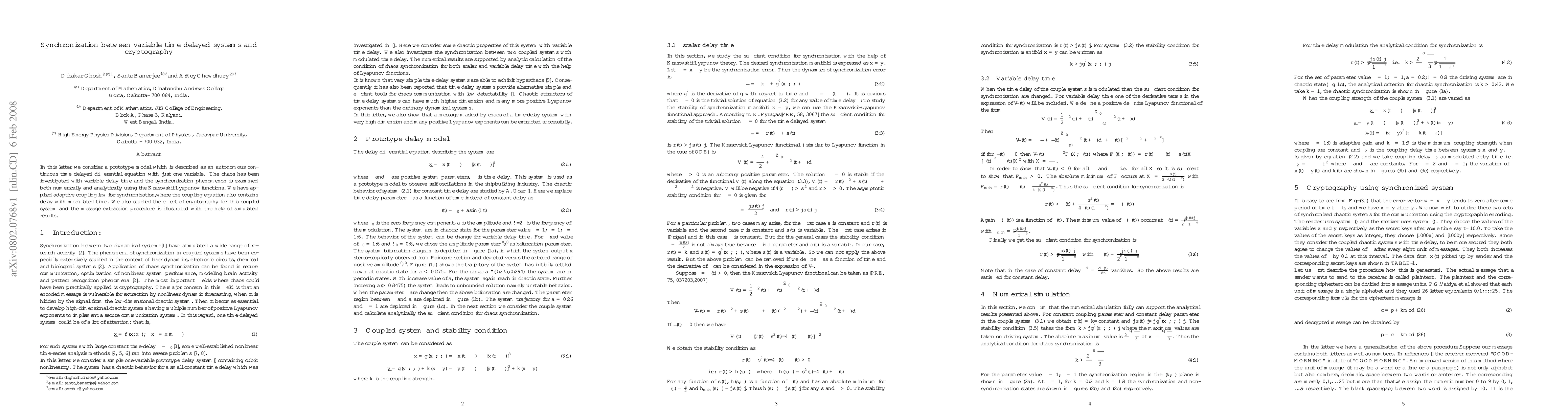 This paper investigates synchronization in a variable time-delayed chaotic system using adaptive coupling and Krasovskii-Lyapunov functions, and explores its application in cryptography with demonstrated message extraction through simulations.