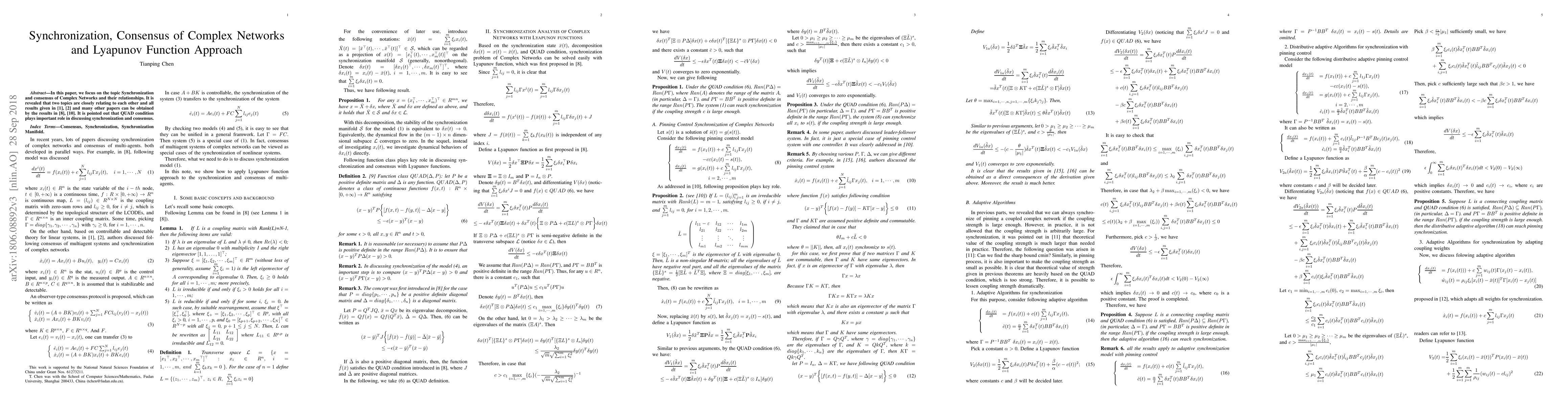 In this paper, we focus on the topic Synchronization and consensus of Complex Networks and their relationships. It is revealed that two topics are closely relating to each other and all results given in \cite{Li1,Li2} and many other papers can be obtained by the results in \cite{Chen1,Chen2}. It is pointed out that QUAD condition plays important role in discussing synchronization and consensus.