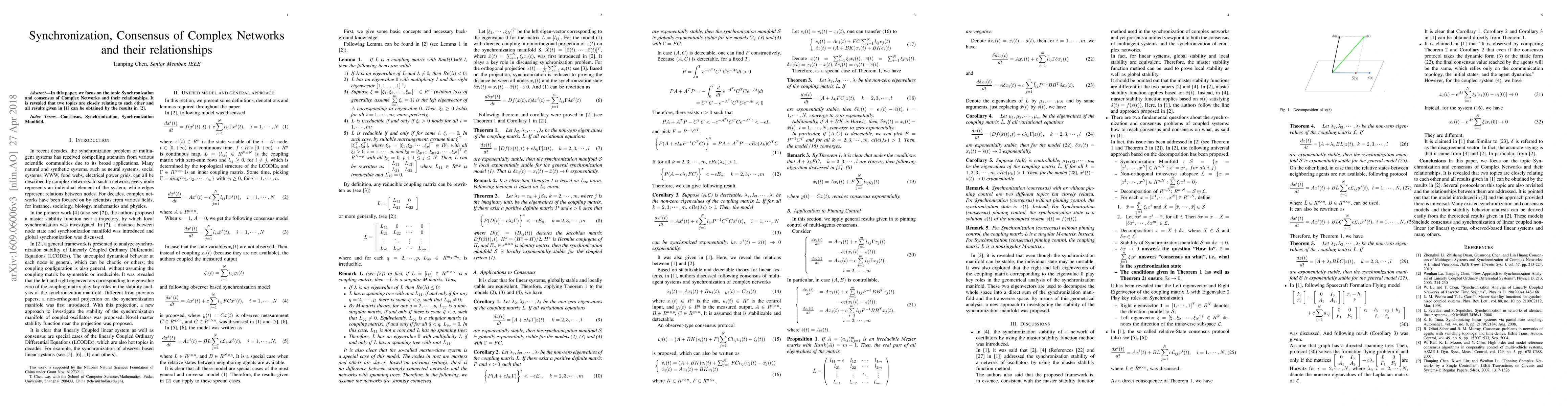Summary: This paper explores the synchronization and consensus in complex networks, demonstrating their close relationship and showing that the results from one study can be derived from another, specifically linking findings from \cite{Li} to those in \cite{Lu2006}.