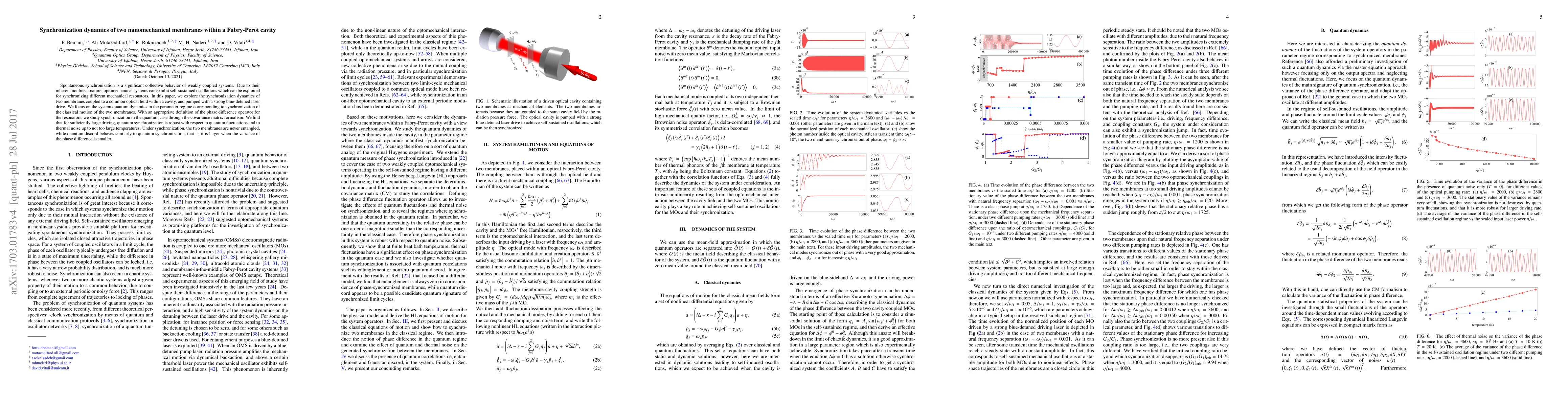 This paper investigates the synchronization dynamics of two nanomechanical membranes in a Fabry-Perot cavity, driven by a strong blue-detuned laser. It finds that quantum synchronization is robust against quantum fluctuations and thermal noise, and that quantum discord correlates with synchronization strength.