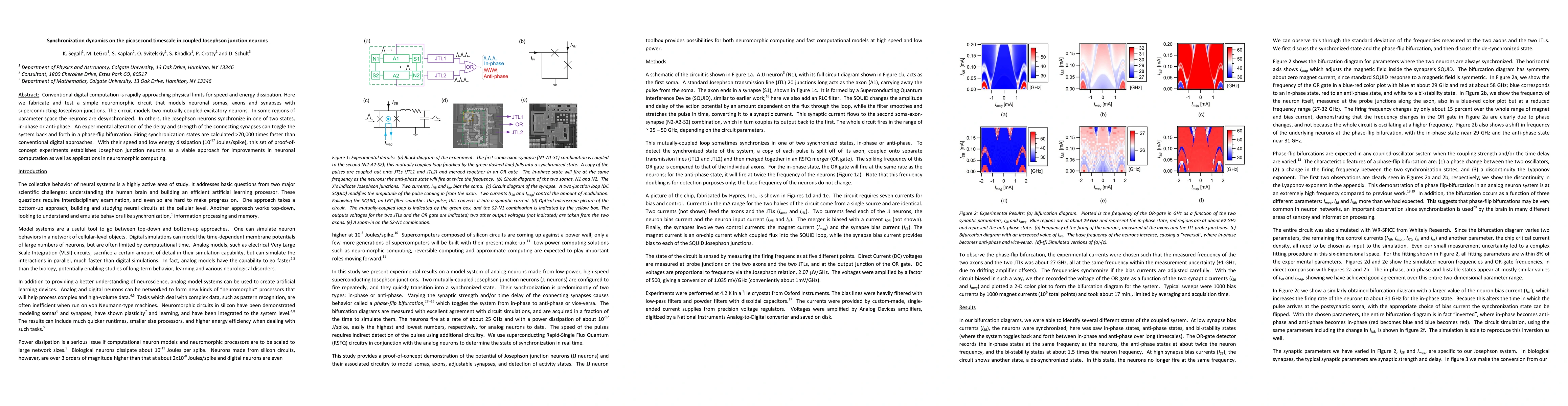 This research demonstrates a neuromorphic circuit using superconducting Josephson junctions to model coupled neurons, showing synchronization dynamics on picosecond timescales. The system can toggle between desynchronized and synchronized states via synaptic delay and strength adjustments, achieving computations >70,000 times faster than conventional digital methods with low energy dissipation.