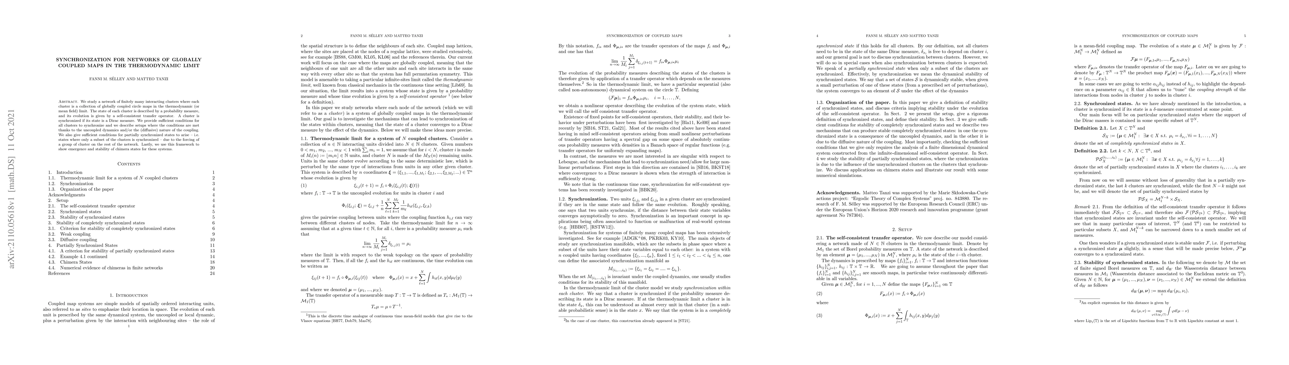 We study a network of finitely many interacting clusters where each cluster is a collection of globally coupled circle maps in the thermodynamic (or mean field) limit. The state of each cluster is described by a probability measure, and its evolution is given by a self-consistent transfer operator. A cluster is synchronized if its state is a Dirac measure. We provide sufficient conditions for all clusters to synchronize and we describe setups where the conditions are met thanks to the uncoupled dynamics and/or the (diffusive) nature of the coupling. We also give sufficient conditions for partially synchronized states to arise -- i.e. states where only a subset of the clusters is synchronized -- due to the forcing of a group of cluster on the rest of the network. Lastly, we use this framework to show emergence and stability of chimera states for these systems.