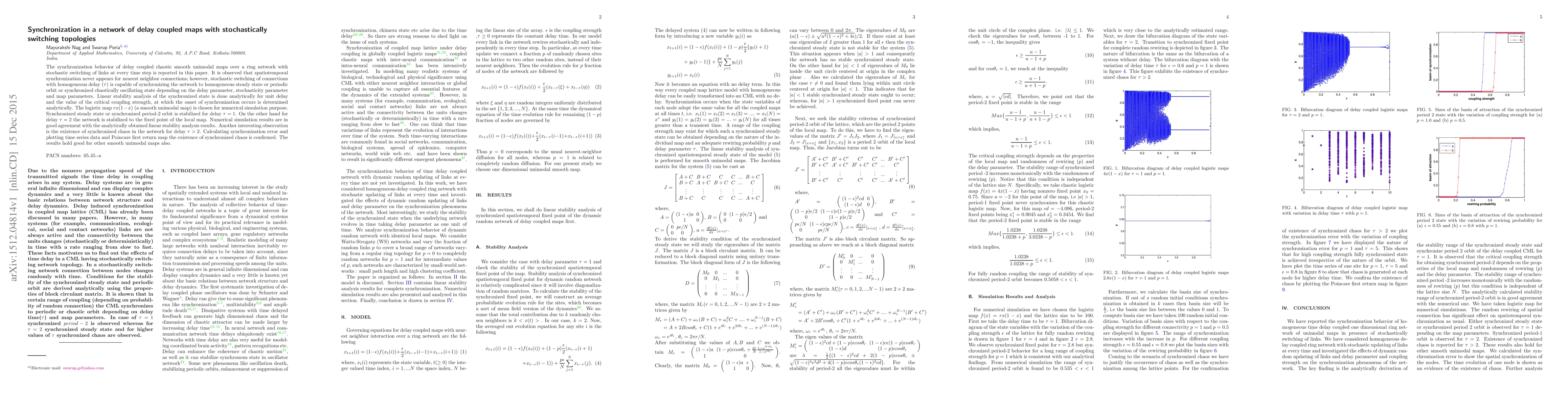 This paper investigates synchronization in a network of delay-coupled chaotic maps with stochastically switching topologies. It finds that while nearest neighbor connections fail to achieve spatiotemporal synchronization, stochastic switching with homogeneous delay can lead to synchronization in various states depending on the delay and stochasticity parameters, with synchronized chaos emerging for delays greater than 2.