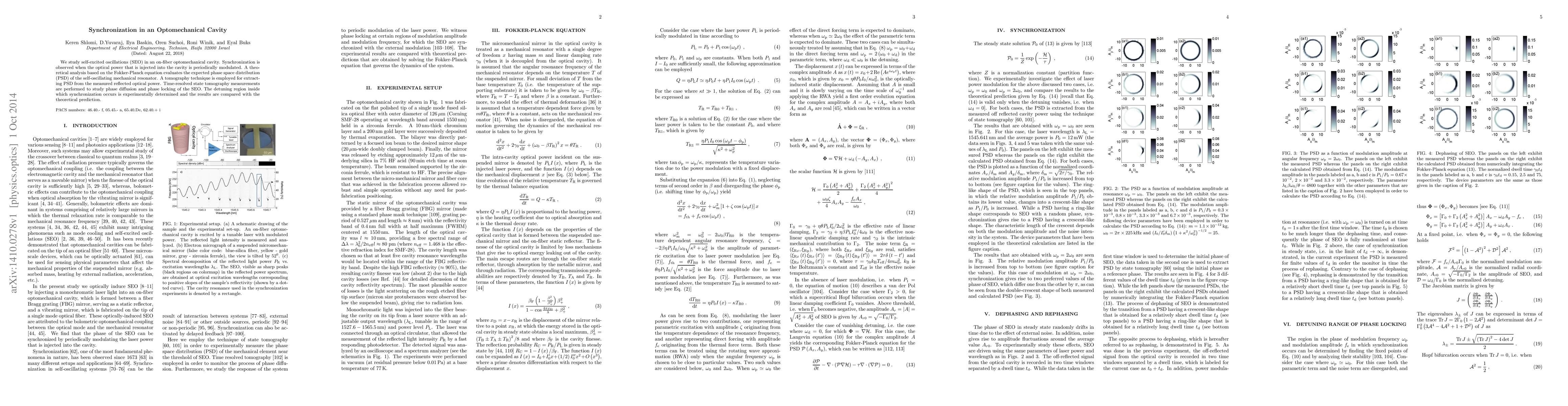 We study self-excited oscillations (SEO) in an on-fiber optomechanical cavity. Synchronization is observed when the optical power that is injected into the cavity is periodically modulated. A theoretical analysis based on the Fokker-Planck equation evaluates the expected phase space distribution (PSD) of the self-oscillating mechanical resonator. A tomography technique is employed for extracting PSD from the measured reflected optical power. Time-resolved state tomography measurements are performed to study phase diffusion and phase locking of the SEO. The detuning region inside which synchronization occurs is experimentally determined and the results are compared with the theoretical prediction.
