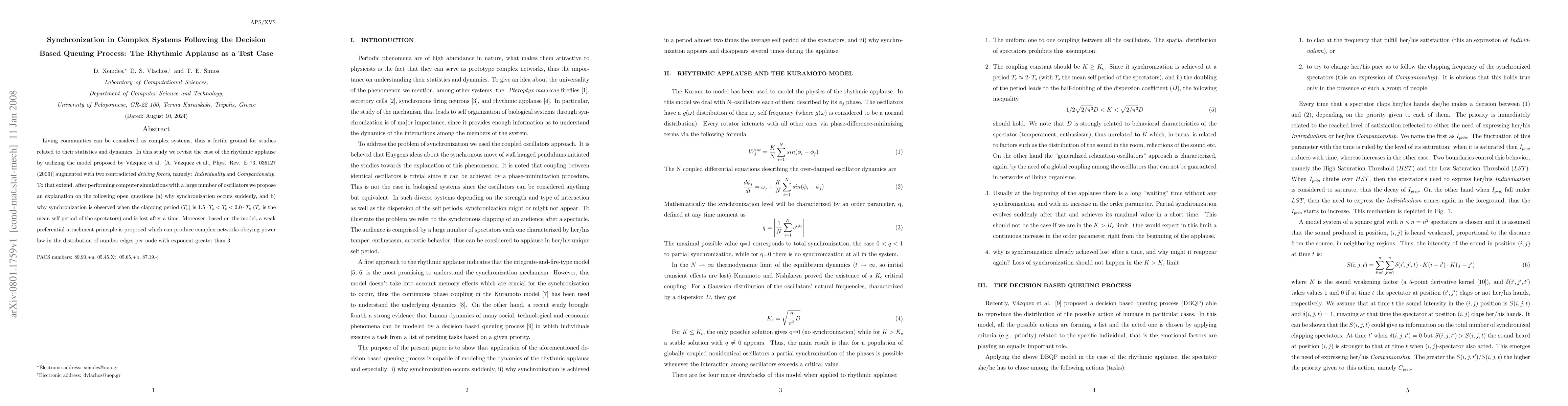 Living communities can be considered as complex systems, thus a fertile ground for studies related to their statistics and dynamics. In this study we revisit the case of the rhythmic applause by utilizing the model proposed by V\'azquez et al. [A. V\'azquez et al., Phys. Rev. E 73, 036127 (2006)] augmented with two contradicted {\it driving forces}, namely: {\it Individuality} and {\it Companionship}. To that extend, after performing computer simulations with a large number of oscillators we propose an explanation on the following open questions (a) why synchronization occurs suddenly, and b) why synchronization is observed when the clapping period ($T_c$) is $1.5 \cdot T_s < T_c < 2.0 \cdot T_s$ ($T_s$ is the mean self period of the spectators) and is lost after a time. Moreover, based on the model, a weak preferential attachment principle is proposed which can produce complex networks obeying power law in the distribution of number edges per node with exponent greater than 3.