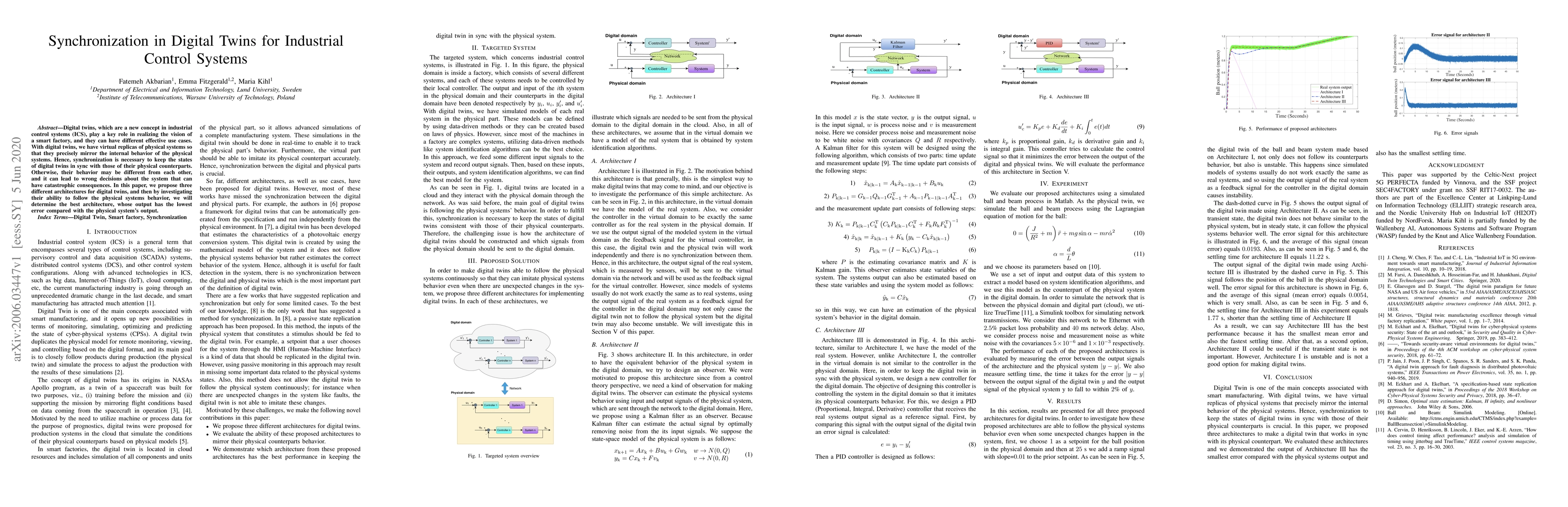 This paper explores synchronization in digital twins for industrial control systems, proposing three architectures to maintain accurate mirroring of physical systems. The study aims to determine which architecture minimizes discrepancies, ensuring reliable decision-making in smart factories.